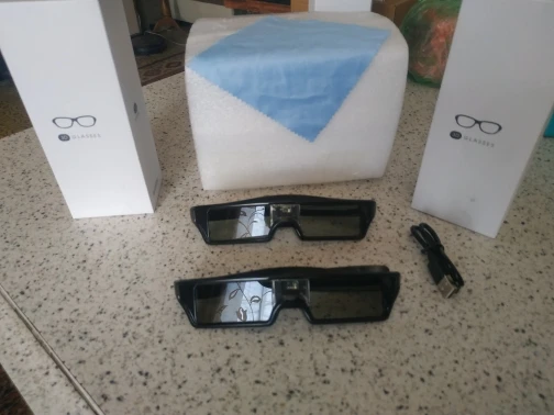 Получил очки в течение 3 недель. Они хорошо работают с моим DLP проектором D29. Стоит отметить, что они темнеют изображение, поэтому вам нужна темная комната или яркий проектор, чтобы получить максимальную отдачу от 3D эффекта. Каждая пара очков поставляется с инструкциями, кабелем для зарядки micro-USB и салфеткой для очистки.
