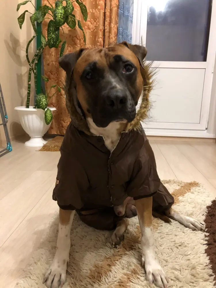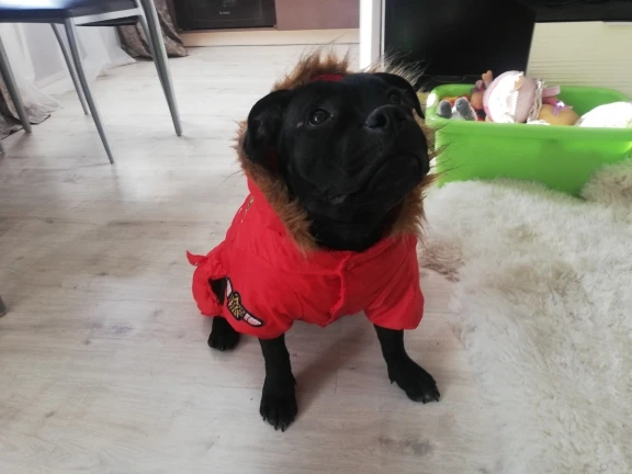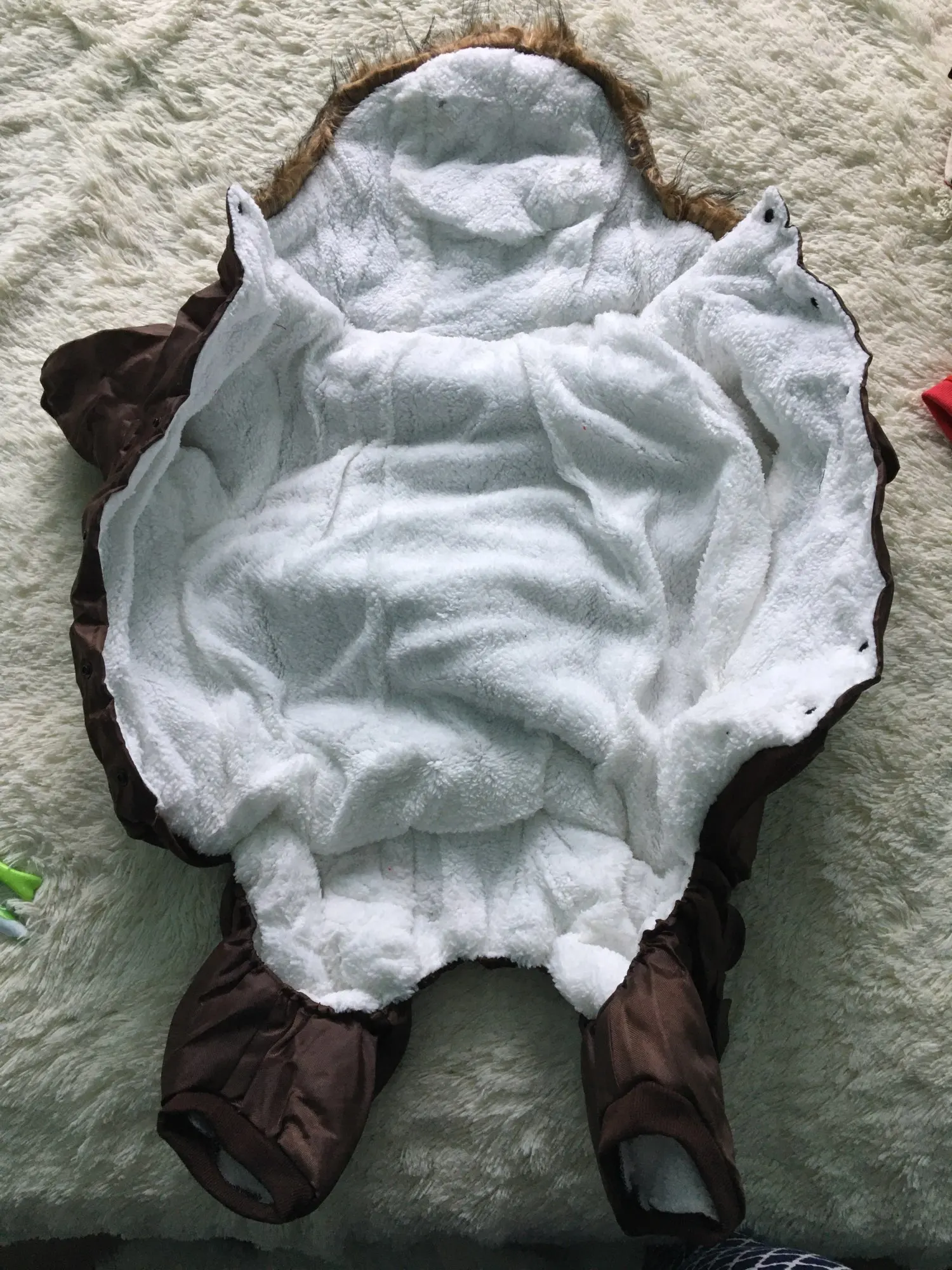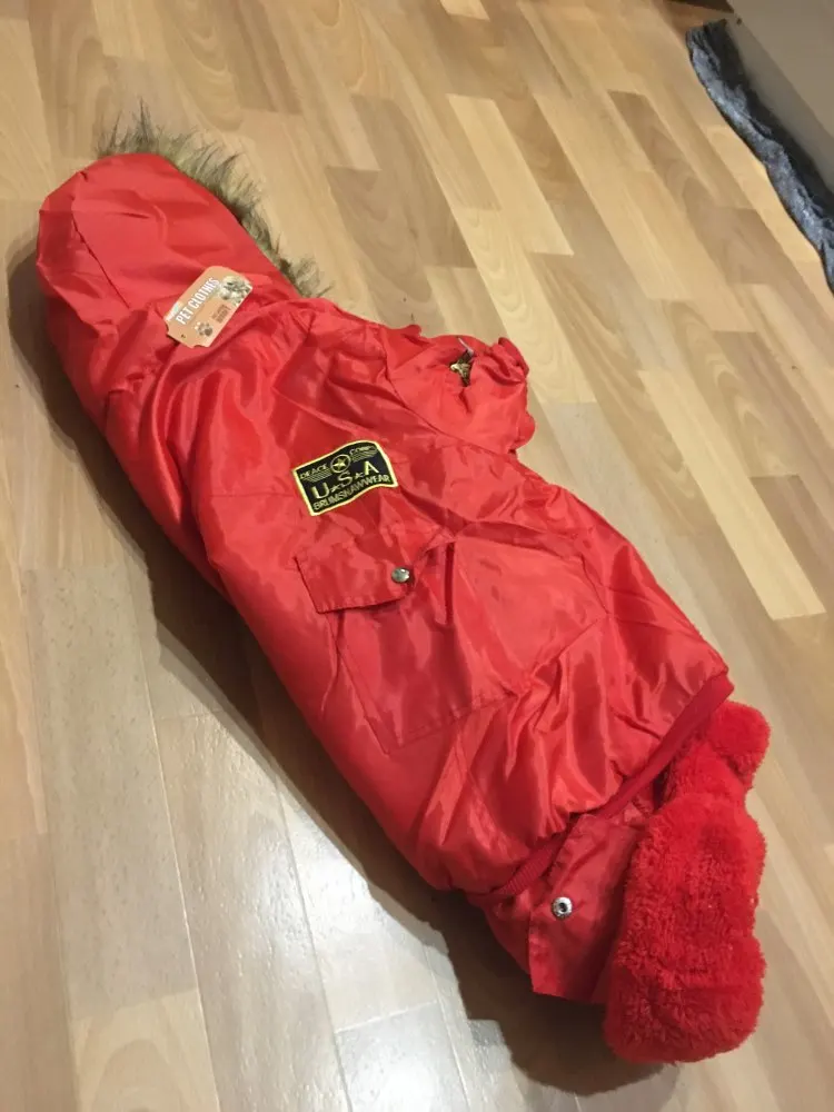 Комбинезон просто супер!!! Доставка месяц. Пошито очень хорошо, единственное мех на капюшоне не такой пушистый. У меня Шарпей девочка, спина 55 см, грудь 66 см подошло идеально. Заказывайте не пожалеете. Спасибо огромное продавцу, и АлиЭкспресс!!!