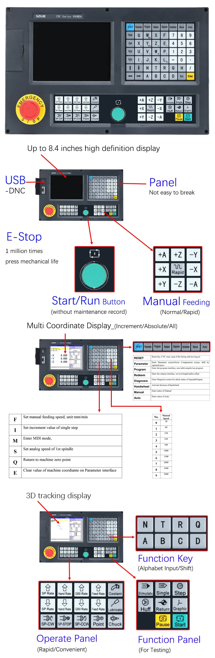 SZGH-CNC990MDb-3 является универсальным трехосевым фрезерным контроллером с ЧПУ и управлением X,Y,Z тремя осями, двумя шпинделями anglog, 2 мс интерполяция на высокой скорости, 1 мкм точность, что, очевидно, повышает эффективность, точность и качество поверхности деталей для обработки. Новый интерфейс USB, он поддерживает работу файлов и программы, работающие на флэш-диске. Он предоставляет множество команд цикла жесткого нарезания, сверления, расточки, фрезерования. И т. д.