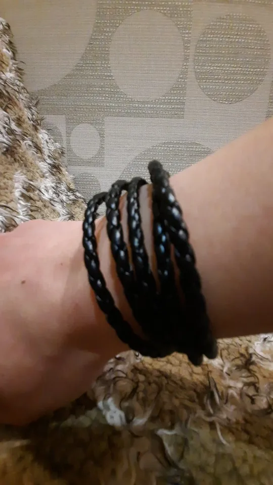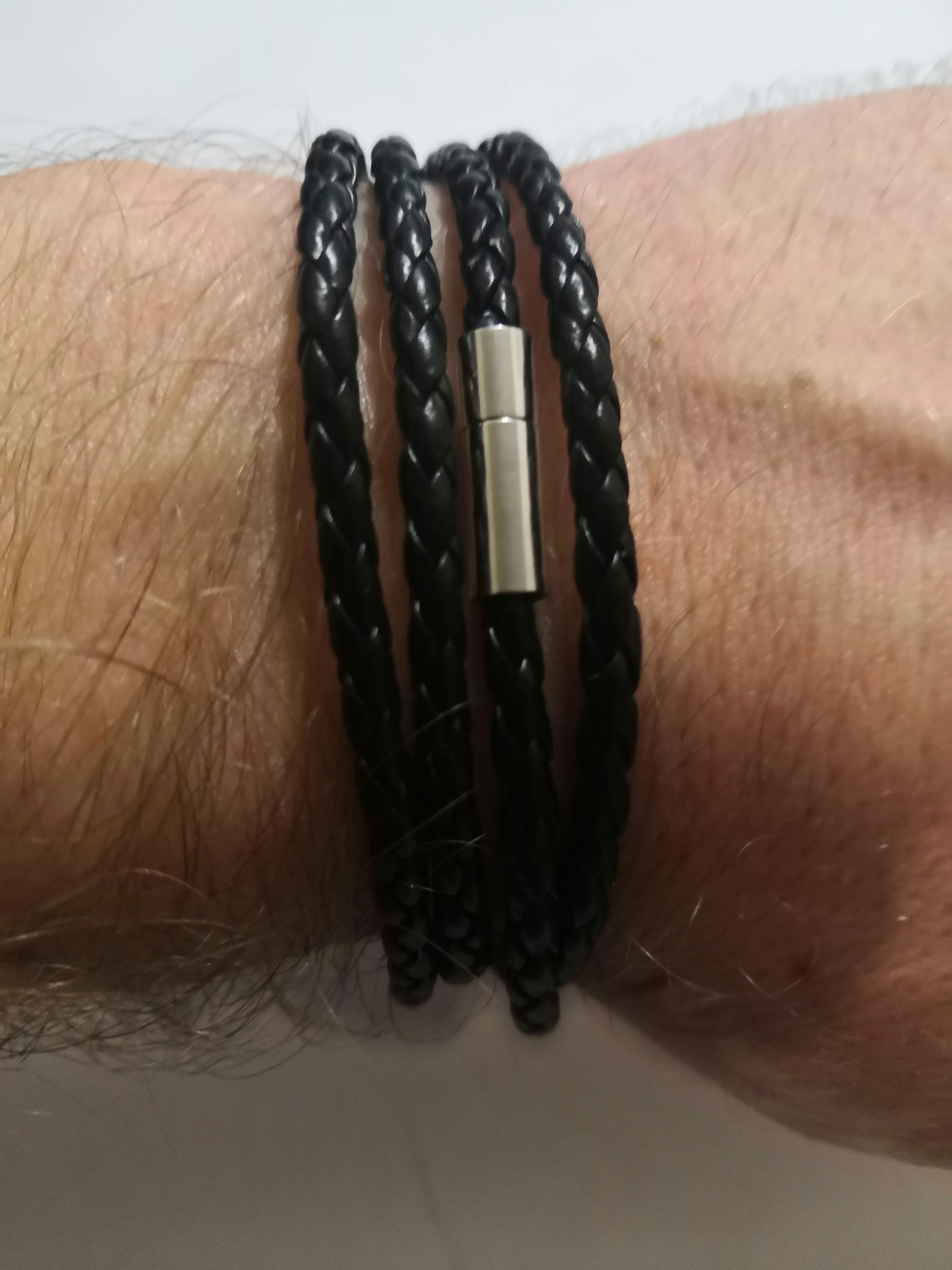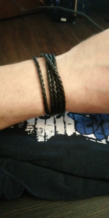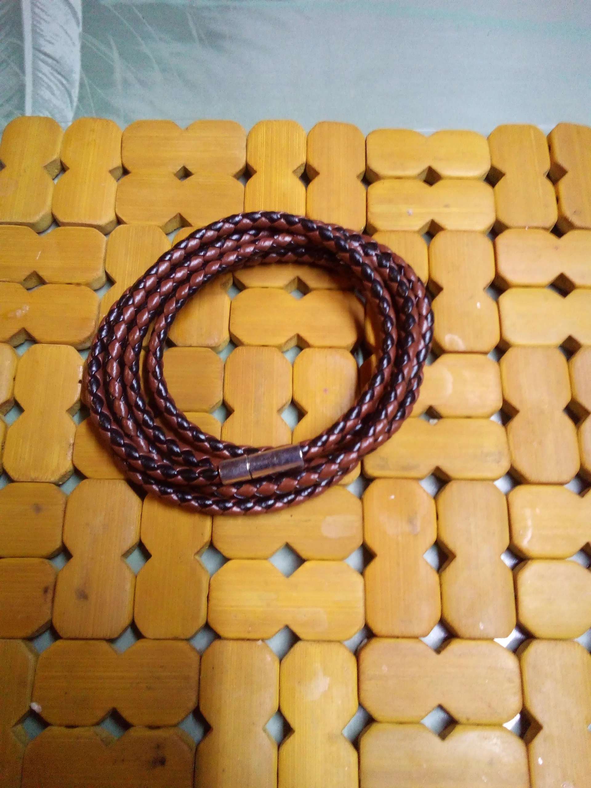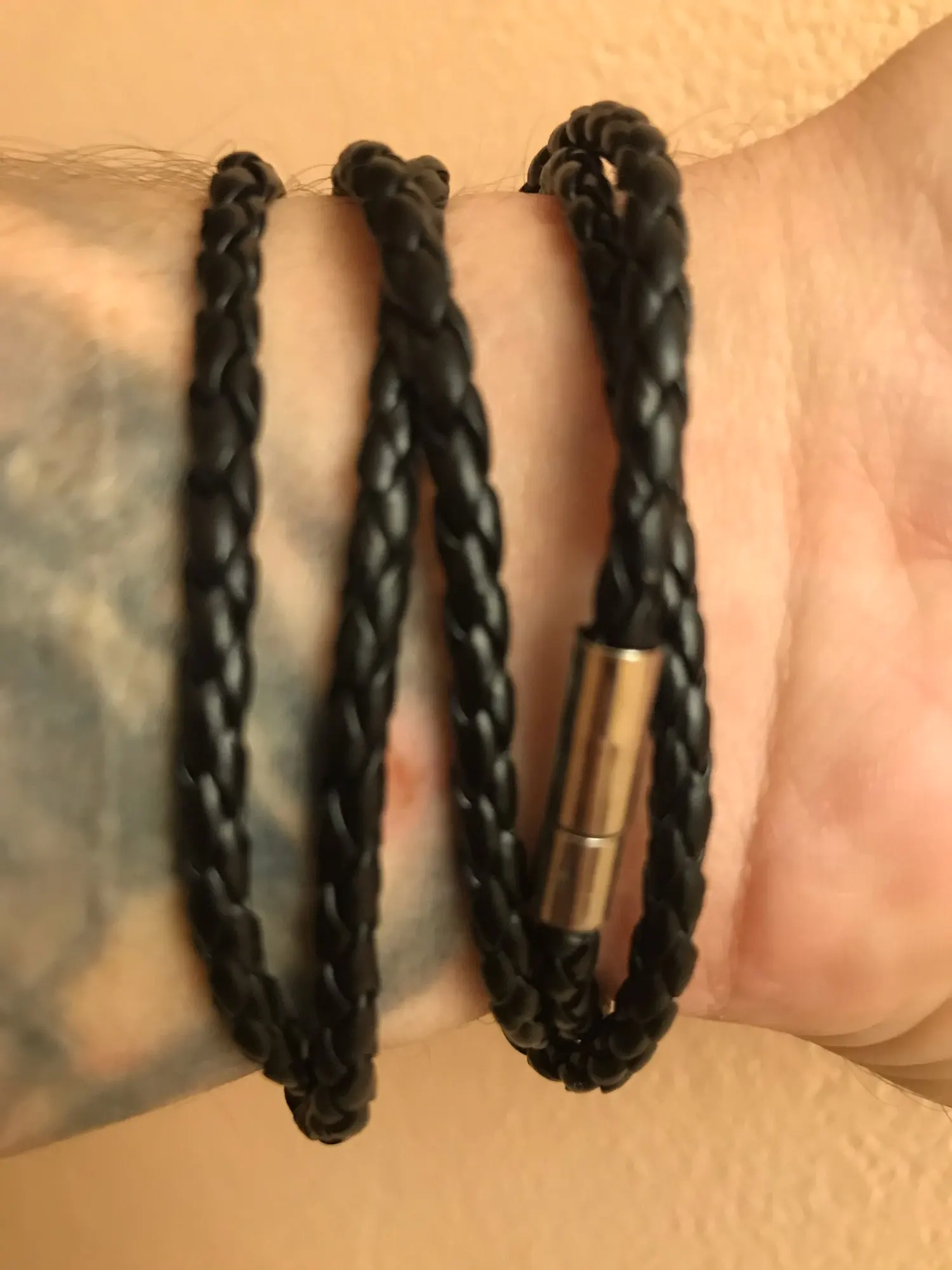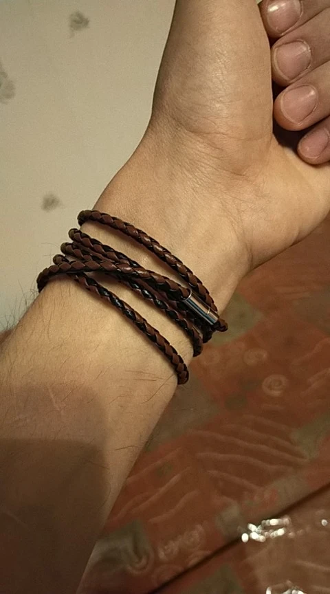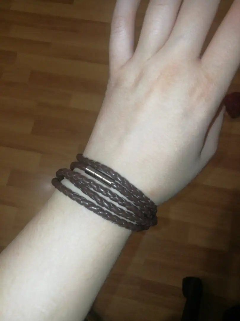 Обычный кожаный браслет. Покупала своим мальчишкам-внукам. Доставка больше месяца. Качество нормальное. Огибается несколько раз вокруг руки. Магнитная застёжка.