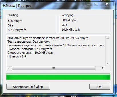 Предупреждение: Протестировано всего 60394 60395 Мбайт. Тест закончен без ошибок. Скорость записи: 8,92 Мбит/с Скорость чтения: 18,7 Мбит/с