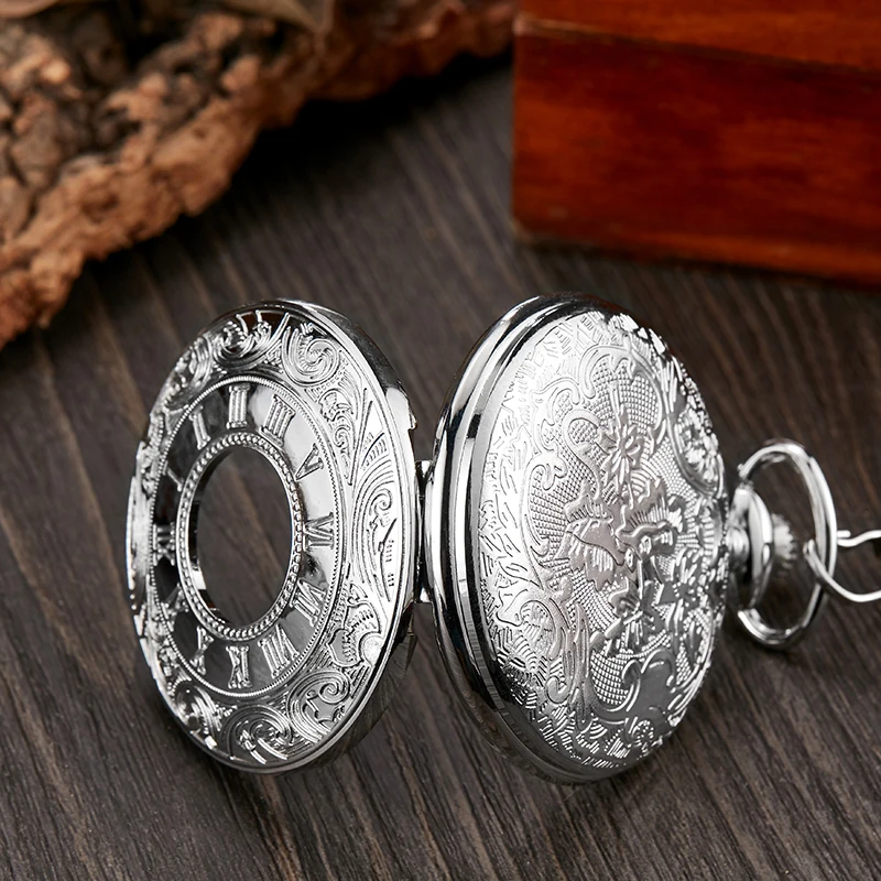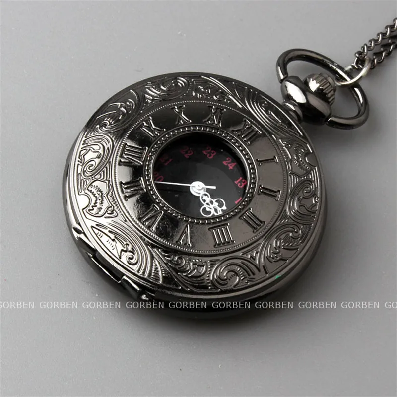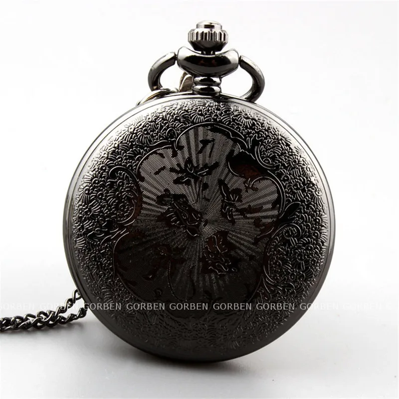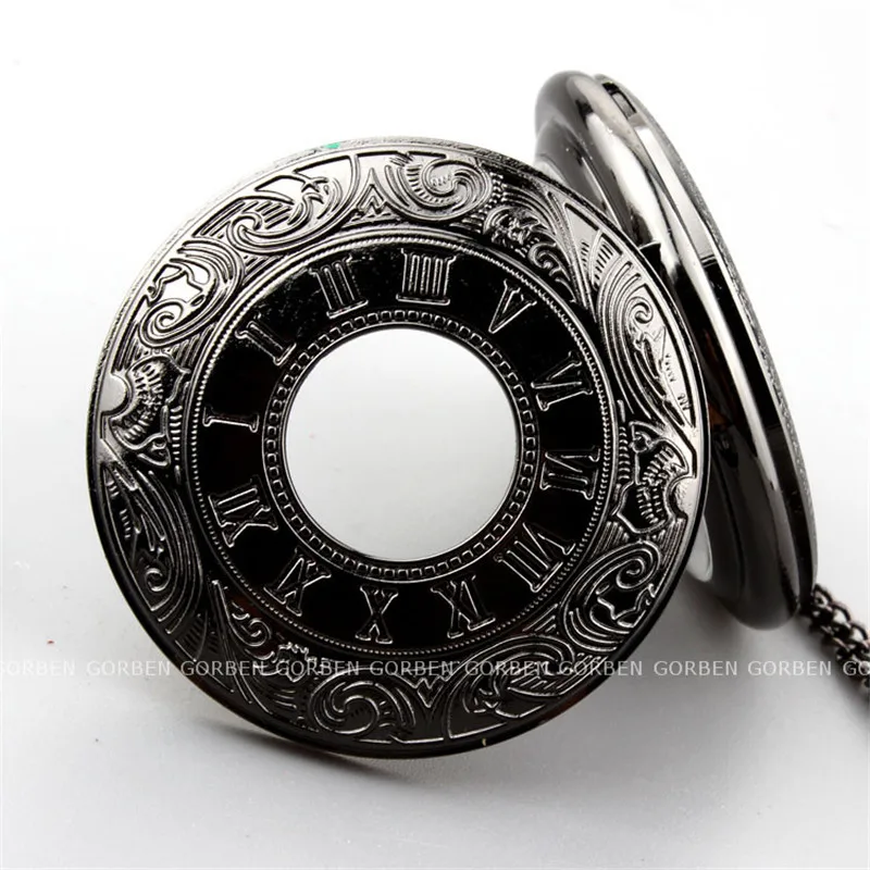 Карманные часы в стиле ретро, черные, в стиле стимпанк, с римскими цифрами, мужские, на цепочке, с подвеской, подарки для женщин, кварцевые карманные часы-скелетоны с отверстиями