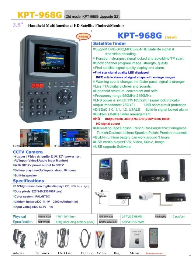 KPT-968G цифровой satllite finder 3,5 дюймов TFT LED ручной многофункциональный спутниковый Finder & Monitor KPT-968G