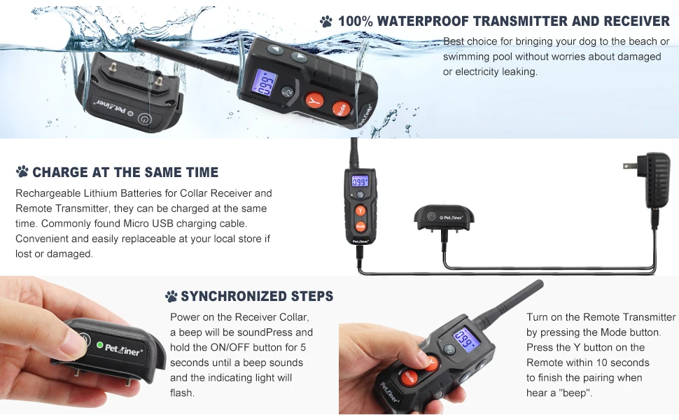 ● Водные возможности: водонепроницаемый пульт дистанционного управления передатчиком и приемником воротника