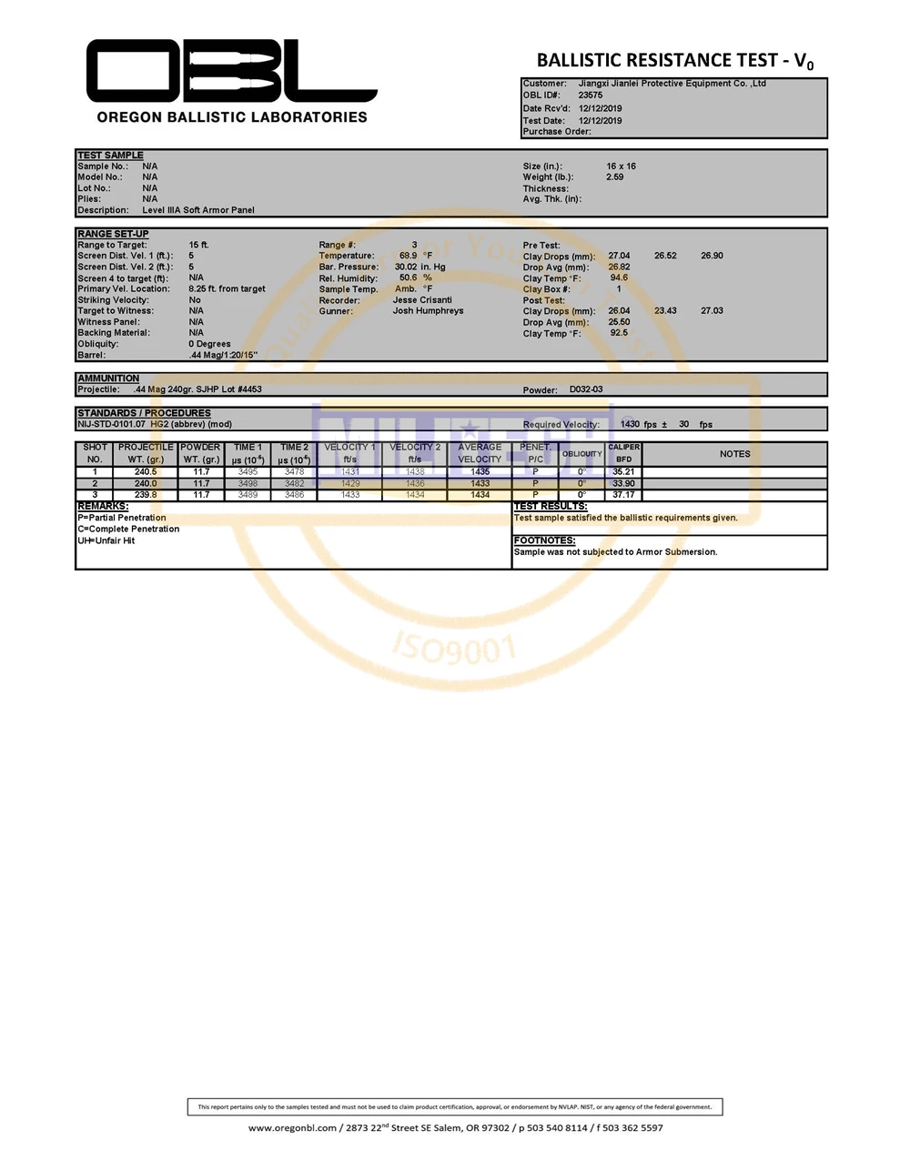 Экологический/условный отчет об испытаниях от HP. Белый, USA--.44 Магнум протестирован при травме не более 36 мм!Эта группа также квалифицирована для того, чтобы остановить взрывы бомб и взрывы, так как официальный сертификат H.P White указан ниже;