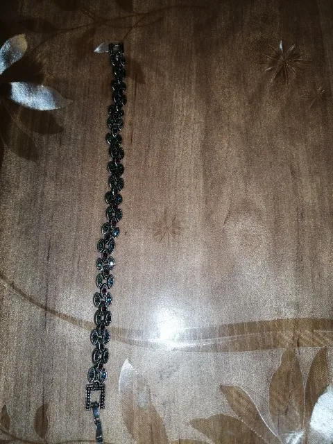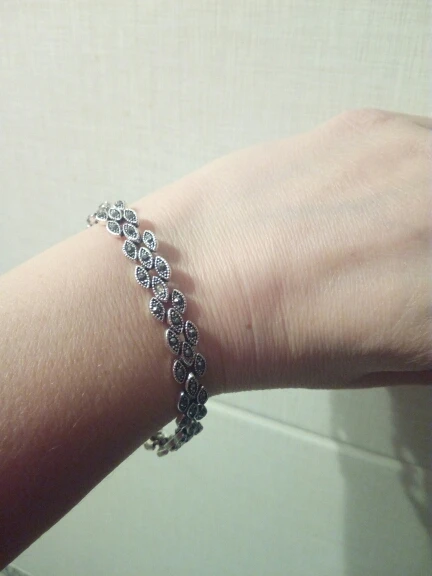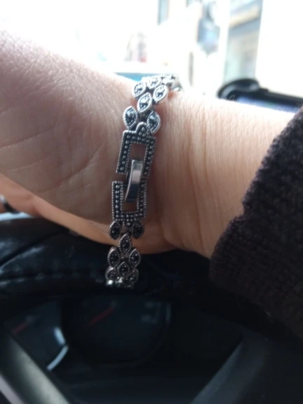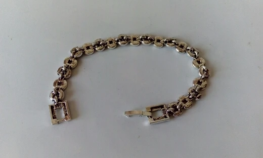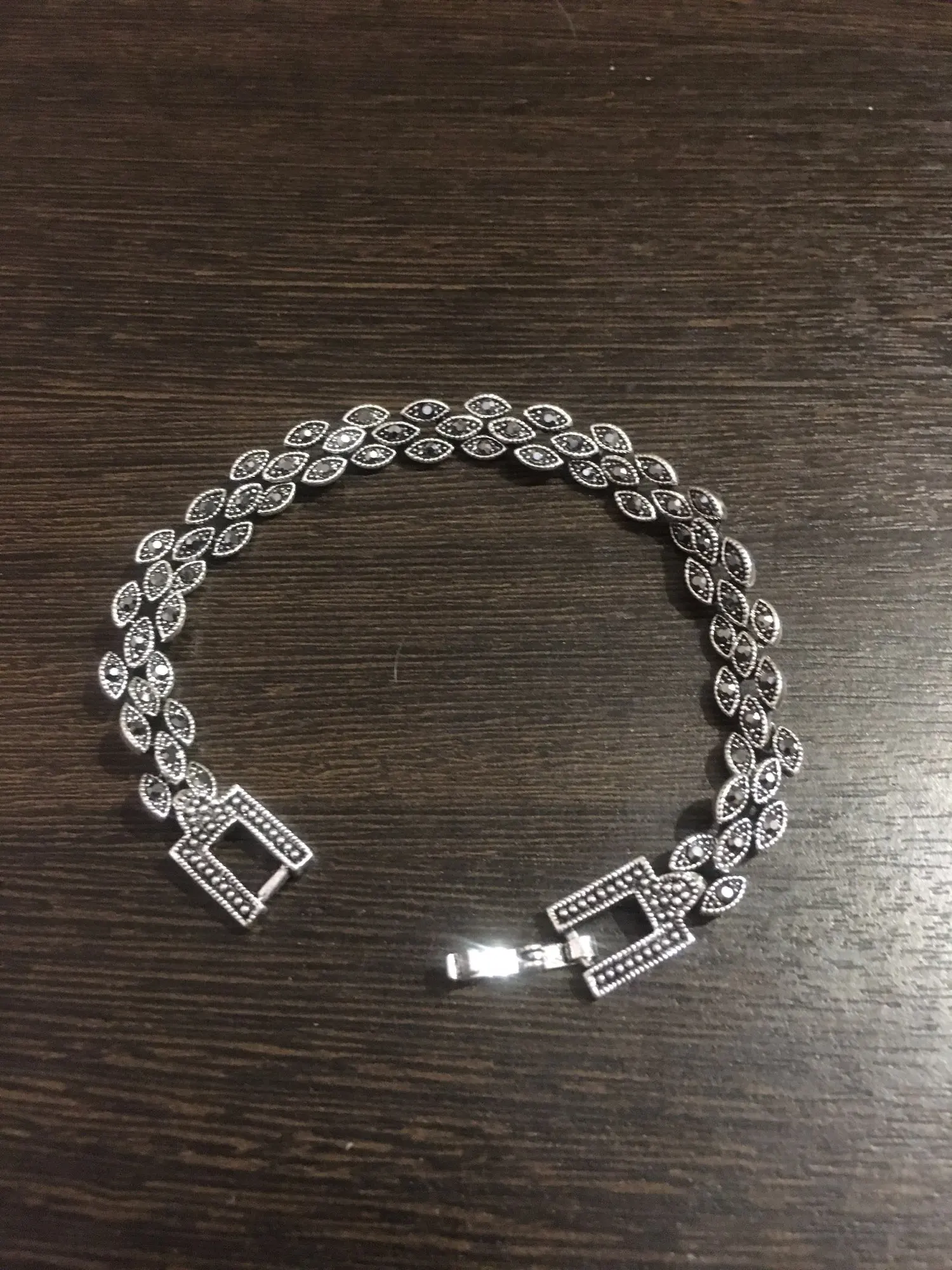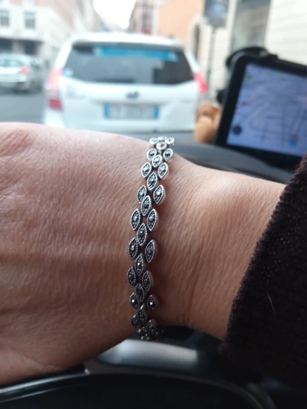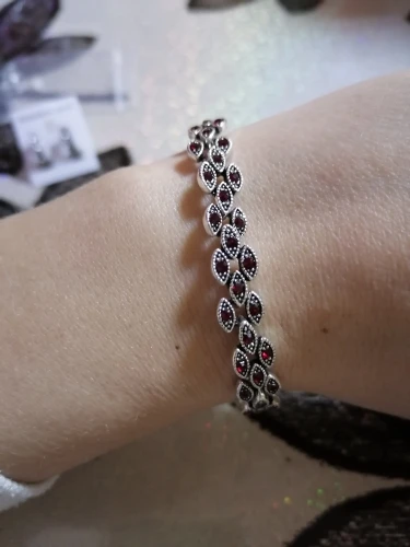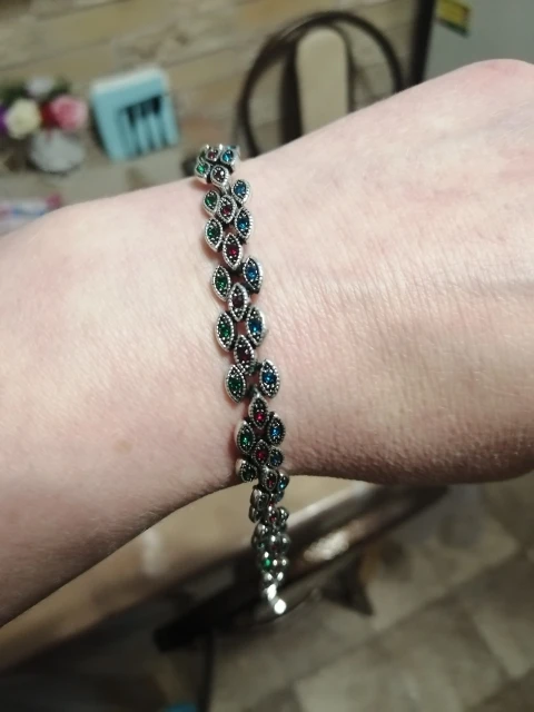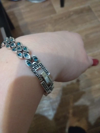 Браслет серебряного цвета, но очень тяжёлый металл. грубые соединительные колечки не позволяют браслету лежать на руке, звенья постоянно крутятся. Кто-то скажет , что это для игры камешков хорошо. Я считаю, что просто грубая работа. При плоском соединении звеньев браслет бы только выиграл. Был бы не так груб и не потерял бы своей пластичности и гибкости. Абсолютно непонятна маркировка 925. К серебру там очень далеко и по цвету, и по весу изделия. В остальном : камешки все на месте, сверкают, переливаются. Браслет смотрится хорошо. Возможно, что в носке будет переворачиваться из-за колец на тыльной стороне. Браслет требует доработки, возможно, замены колечек, связывающих звенья. Доставка в рамках заявленной.