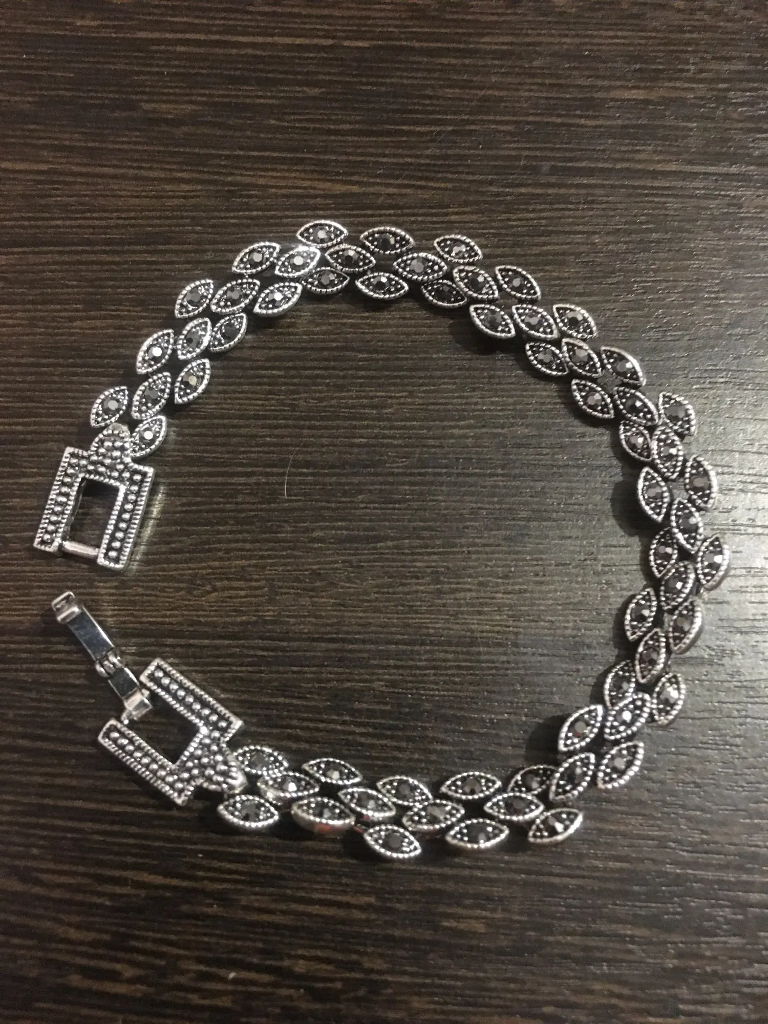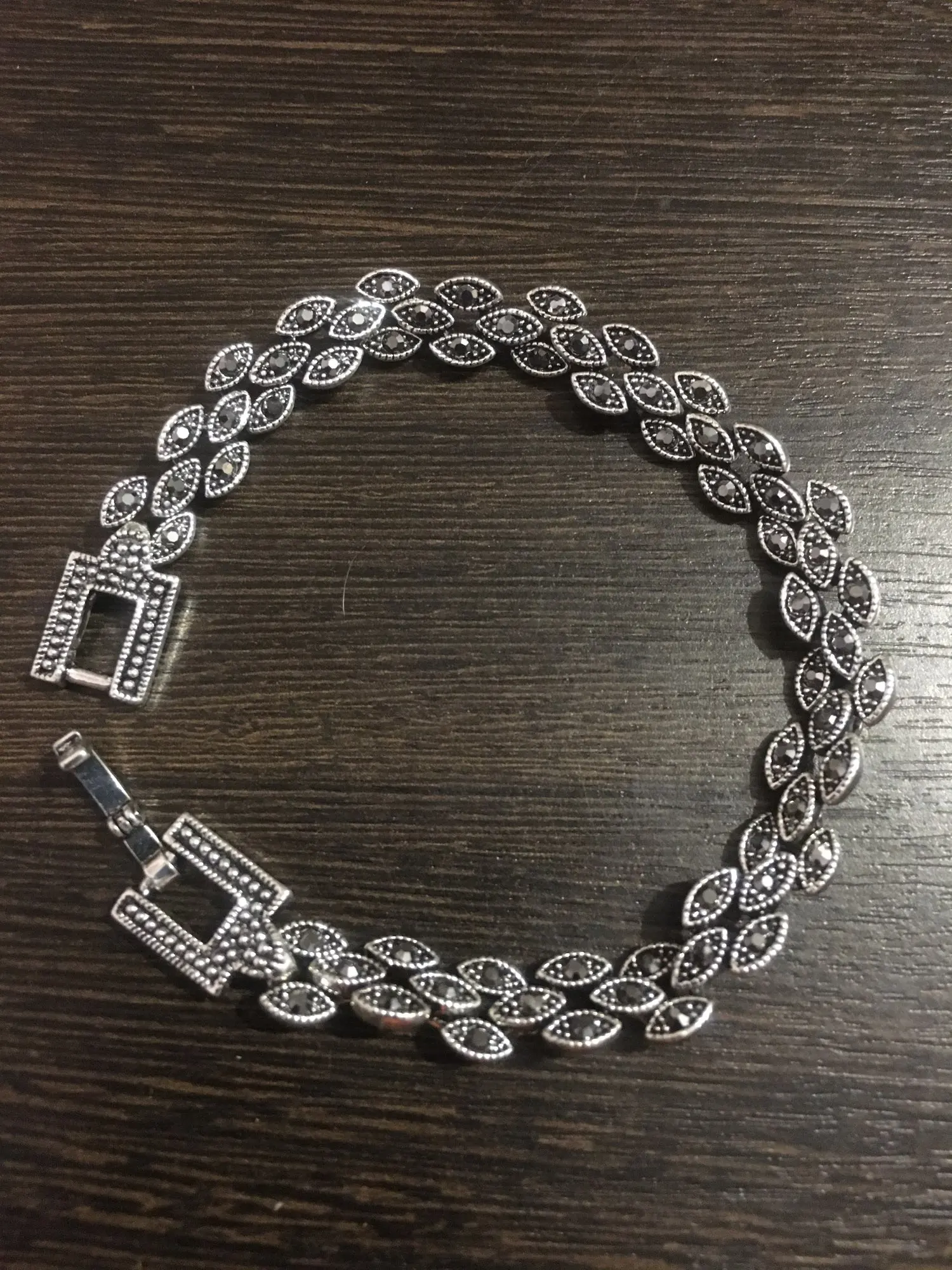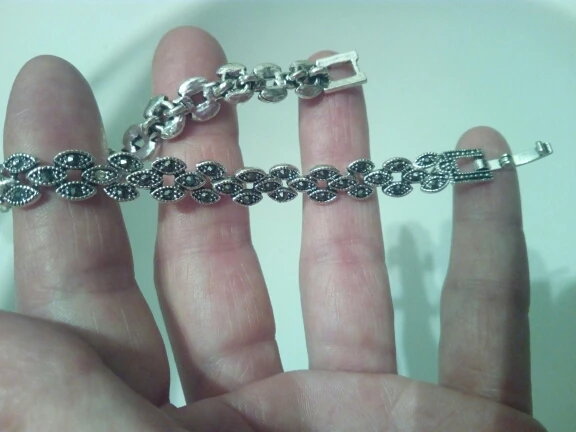 Браслет отличный, красиво смотрится, камушки мелкие чёрные сияют. Длина 19 см. На моё тонкое запястье 16 см немного висит, но если отодвинуть - по размеру. Тяжеленький, металлический, гнется хорошо. Рекомендую.