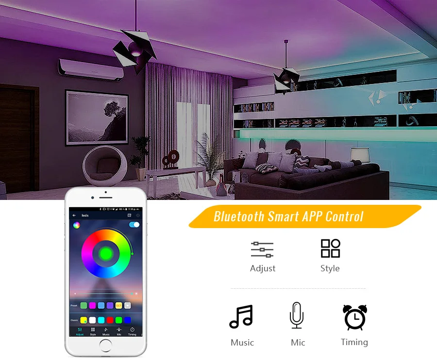 Приложение с Bluetooth очень простое в использовании, они много сияют и имеют все цвета. У него есть полоска, которая может быть удалена сзади, чтобы приклеить ее к любой поверхности, не используя гель. Хороший продукт. Прибыл в указанное время