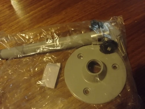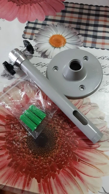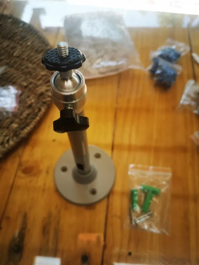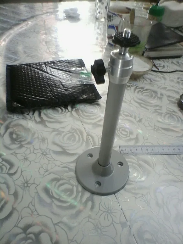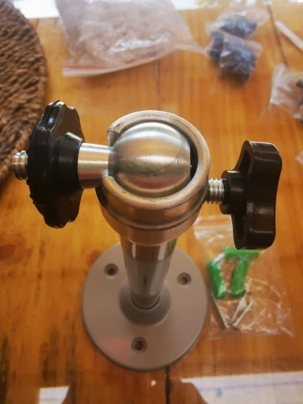 Все как в описании, T4 mini резьба подошла. Супер быстрая доставка до Подмосковья. Для сравнения, на фото рядом с пультом от проектора и проектором. Шарнир хлипковат, но мой проектор лёгкий и держится нормально.