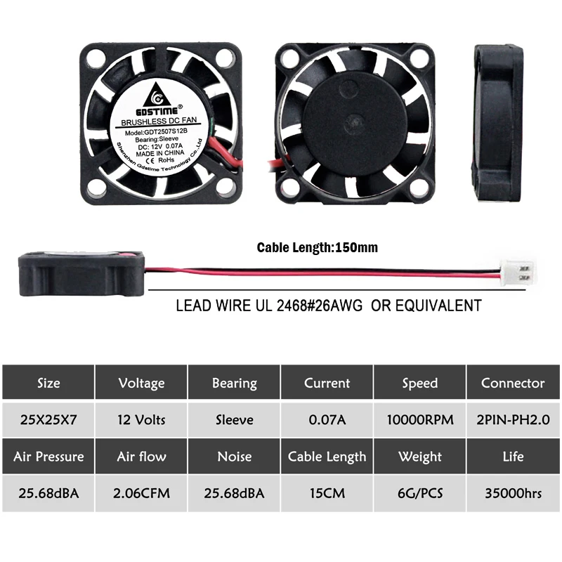 Мини-вентилятор охлаждения GDSTIME 25 мм 25x25x7 мм 12 В с 2-контак...