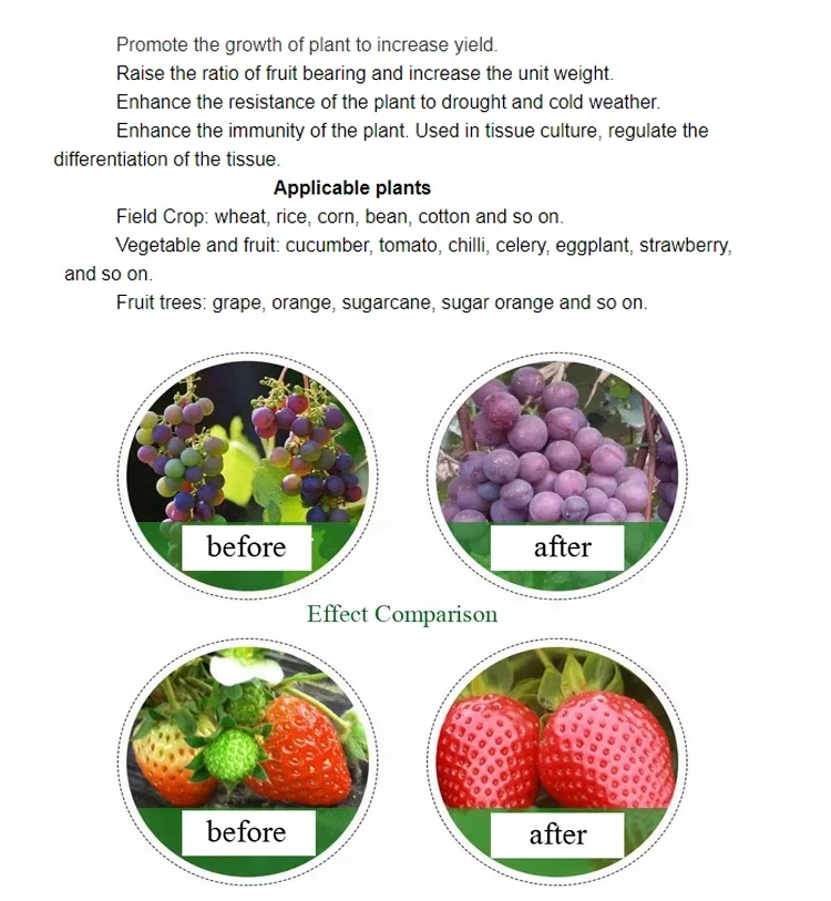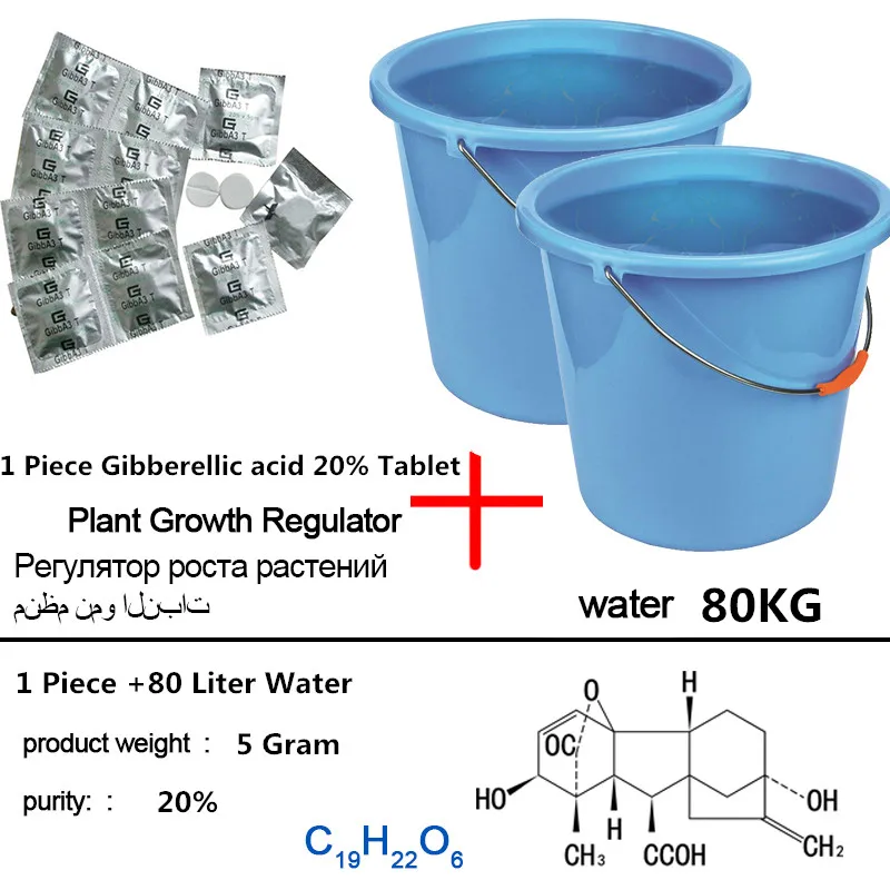 1 шт. можно добавить воду 80 л, 1/2 шт. добавить воду 40 л. 1/4 шт можно добавить 20 литров воды1. Способствует образованию фруктового набора или бессаженых фруктов. Используйте огурец 50-100 мг/кг жидкого спрея для продвижения фруктовых установок и увеличения урожайности во время стадии цветения. 7-10 дней после цветения виноград канифоли распыляет на ухо жидкость 200-500 мг/кг для содействия образованию камня. 2. Способствует вегетативному росту сельдерей распыляется с 50-100 мг/кг жидкости в течение 2 недель до сбора урожая; Листья распыляются 1-2 раза за 3 недели до сбора урожая, что может увеличить стебли и листья. 3. Разрушение режима и продвижение прорастания. Картофель погружены в 0,5-1 мг/жидкость в течение 30 минут до посева; Ячменя пропитан 1 мг жидкости до посева. 4. Замедляющий старение и сохраняющий эффект чесночный мох погружен в основание чесночного мха в течение 10-30 мин с 50 мг/кг жидкости, 5-15 мг/кг жидкости для цитрусовых зеленых фруктов, И 10 мг/кг жидкости для фруктов после сбора урожая. Огурец и арбуз распыляются жидкостью 10-50 мг/кг перед уборкой, что может играть роль свежего сохранения. 5. Регулируя цветение, цветущая сцена хризантемы распыляется с помощью жидкости 1000 мг/кг в стадии вернализации хризантемы, и Цветущий бутон можно продвигать с помощью жидкого спрея 1-5 мг/кг в стадии бутона циклюмена. 6. Как правило, повышается скорость выращивания семян гибридного риса, это начинается с 15% роста среди родителя женского пола, И распыляется 1-3 раза с помощью 25-55 мг/кг жидкого распыления в конце 25%. Сначала используйте низкую концентрацию, затем Используйте высокую концентрацию. Меры предосторожности для использования: 1. Гиббереллиновая кислота водорастворима. Растворите его с небольшим количеством спирта или белого вина перед использованием, а затем Разбавьте до нужной концентрации водой. 2. Семена бесплодия увеличиваются в культур, обработанных гиббереллиновой кислотой, поэтому не рекомендуется оставлять Урожай для сельского хозяйства.
