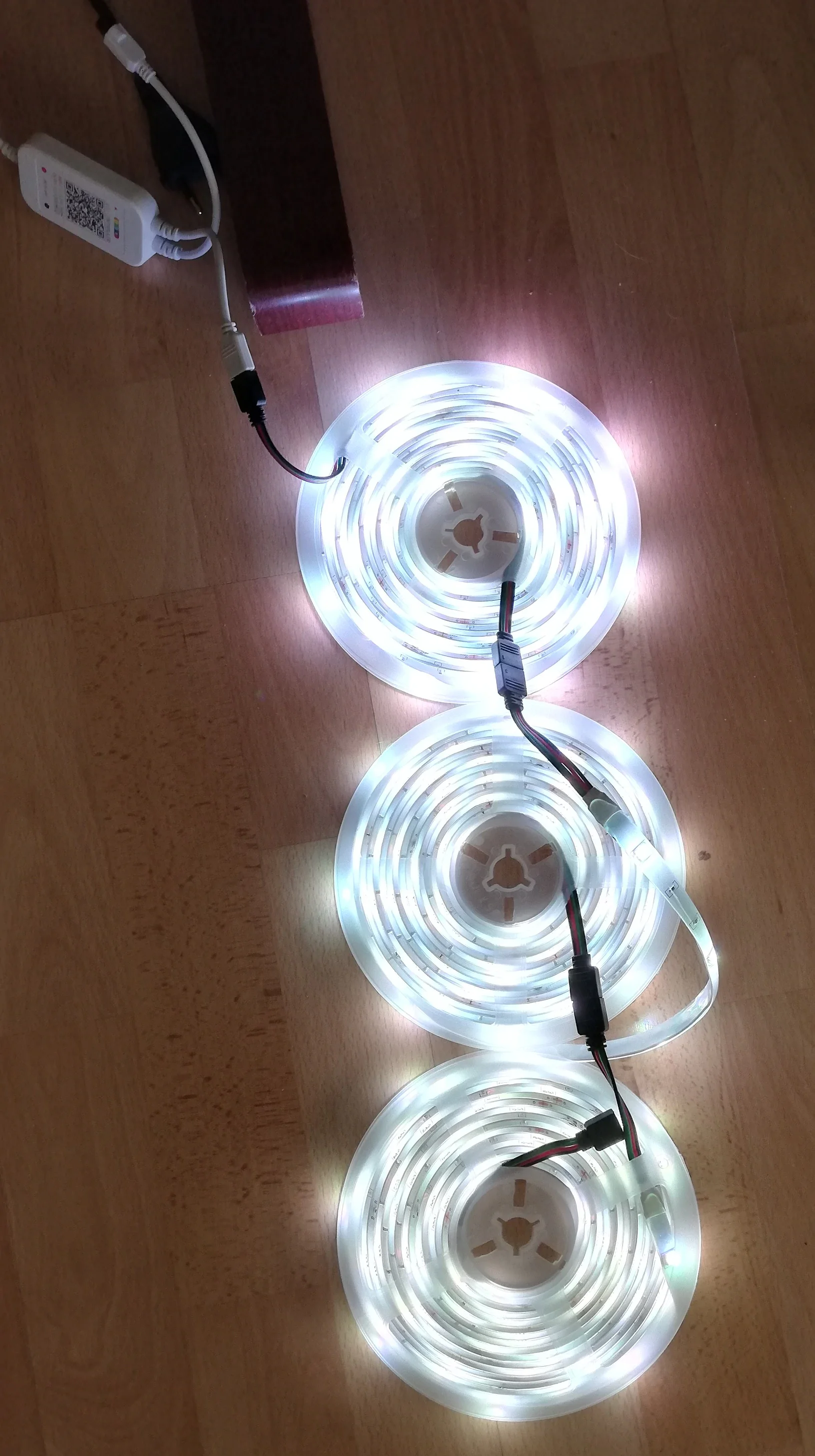 Лента хорошая, можно управлять с телефона. Брал 5050 - не очень яркая, только как подсветку можно использовать, для освещения точно не пойдет