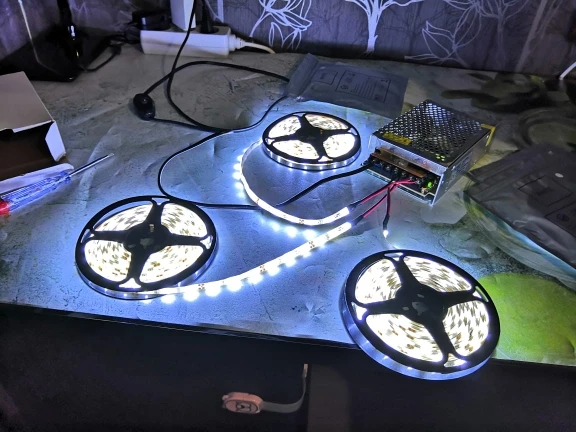 Быстрая доставка. Теперь ярко красным озарено пространство под столом благодаря большой длине ленты ( которую можно если что сократить по специальным линиям отреза). Слой самоклеящийся, обошлось без подручных средств. Оставшуюся часть еще и системник забубеню потом.