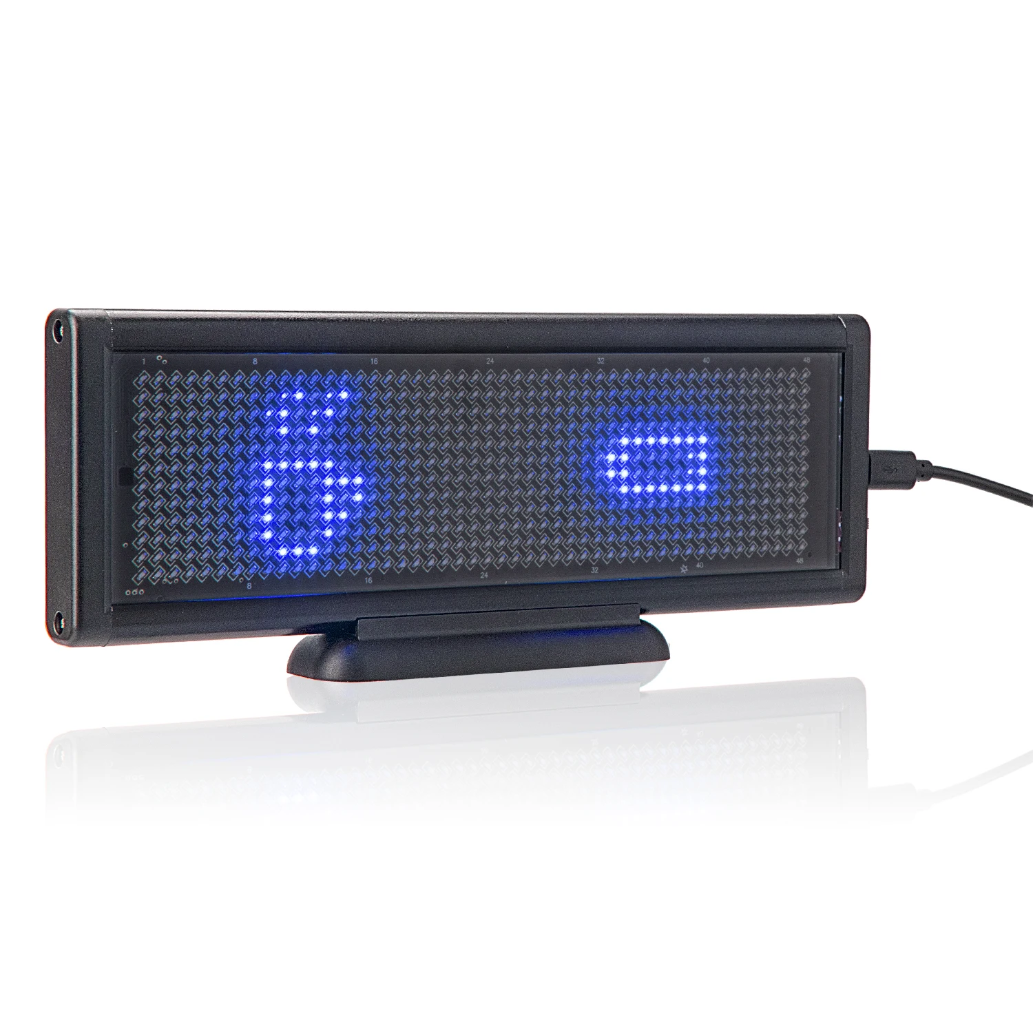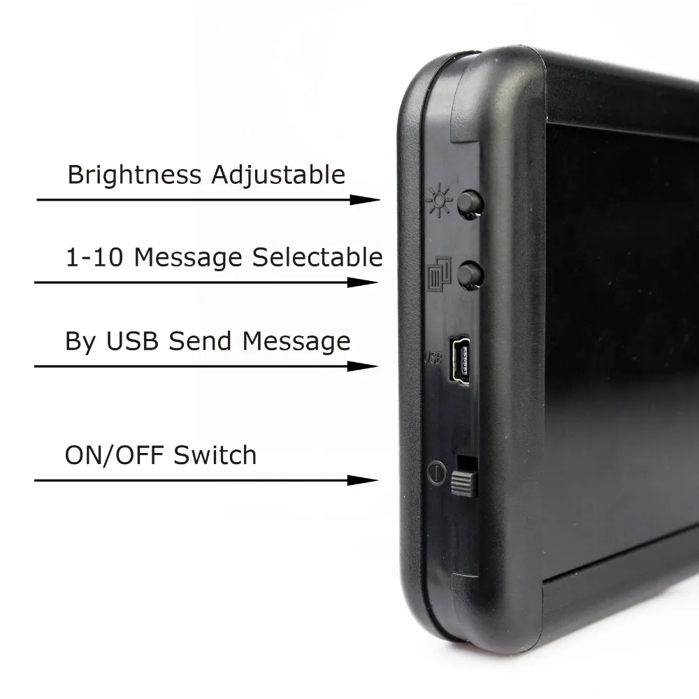 ★Точечная Матрица: 16x64 пикселей★Шаг пикселя: 3 мм★Размер оправы: 100(H)x300(W)X20(T) мм,(10 мм Нижняя подставка),(дюйм: 12 "x 4" x 0,7 ")★Размер экрана: 260x75 мм (дюйм: 10 "x 3")★Вес нетто: 500 г; Вес брутто: 750 г★Легко обновить сообщение через ваш компьютер.★Один мини USB интерфейс для зарядки и связи.★Он отображает 8 западных символов или 6 азиатских символов.★10 текстовых сообщений, каждый из них отображает 250 символов Запада.★Поддержка языков: английский, китайский, японский, корейский, испанский, русский и т. Д.★Эффект отображения: прокрутка, снег, вспышка, удержание, удержание с помощью круга.★Выбор сообщений: либо выберите, чтобы отобразить любое одно текстовое сообщение, либо десять текстовых сообщений/изображений в последовательном порядке, нажав кнопку на задней стороне.★Контроль скорости для отображения эффекта: 8 Регулировка уровня по программному обеспечению★Может отображать время: 00:00:00★Контроль яркости: 4 уровня (25%, 50%, 75%, 100%)★Требования к питанию: перезаряжаемая батарея★Поддержка Windows: Windows XP, Vista, Window 7