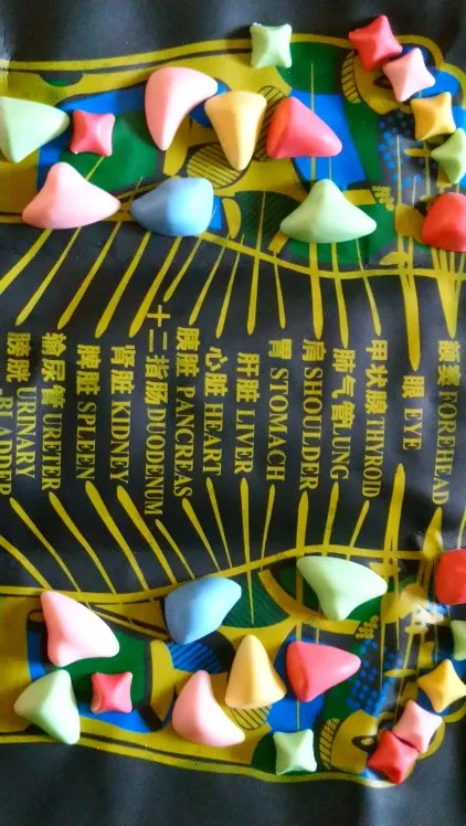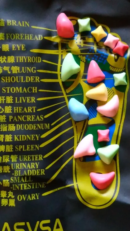 Это маленький коврик, на котором приклеены крашеные пластиковые типа камешки. Стопы примерно на 41-42 рус. размер. Запах за 2 недели выветривания на балконе так и не прошел. На этих типа камнях не постоишь, так как это будет больно стопе. Мы использовали пару раз. Просто сидя на диване ставишь стопы на коврик и держишь так некоторое время, пока не надоест. Муж сказал,что полная херня и забросил этот с запашком коврик обратно на балкон. Всетаки для лечения и массажа лучше использовать более действенные методы.