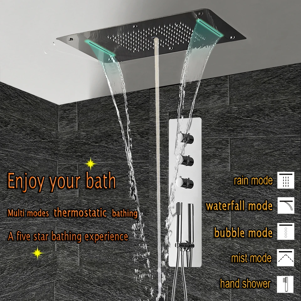 Термостатическая панель для душа из нержавеющей стали, светодиодный смеситель Водопад, Большая насадка для душа, Потолочный Набор, настенный набор дождевая вода