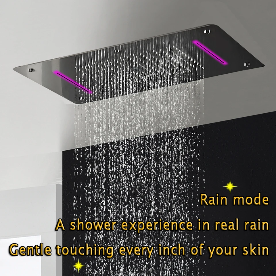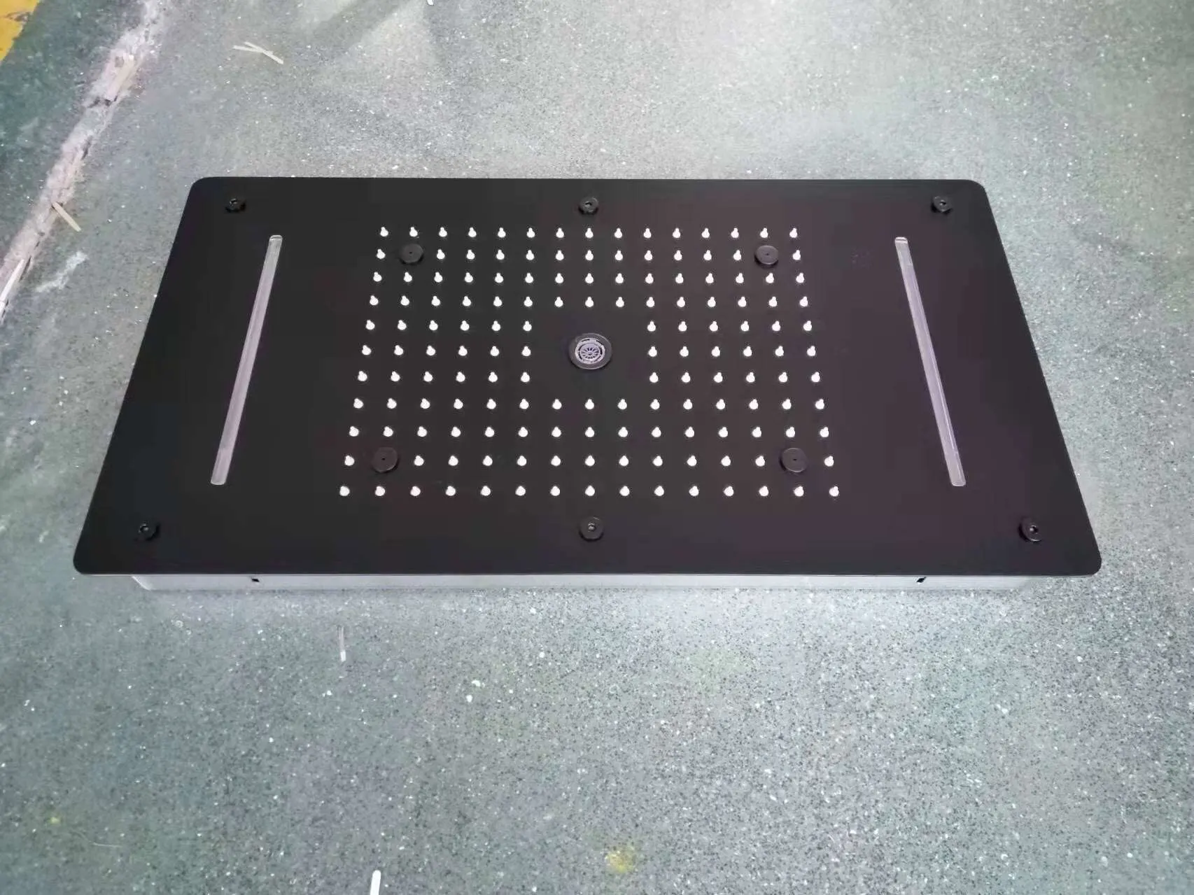 1. Описание душевой головки: она изготовлена из SUS304 и отделана зеркалом, размер700x380мм, Есть4Функции включают:Дождь и водопадИПузырь и туманИ роскошный светодиодный светильник. Он был скрыт, когда мы его устанавливали.