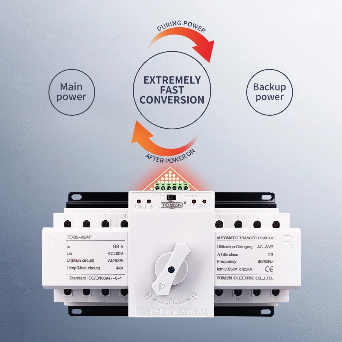 1. ПрименениеTOQ3D-это терминальное устройство автоматической передачи. Подходит для 3 фаз 4 проводов (или 1 Фаза 1 провод) двойная электросеть с переменным напряжением 50/60 Гц, номинальным напряжением 400 В/230 В и номинальным током до 63А. Когда одна мощность идет неправильно (только проверьте нормальную фазу напряжения и резервную фазу напряжения A, только тест потери напряжения или фазы потери), он автоматически подключает один или несколько цепей нагрузки от одной мощности к другой мощности автоматически, чтобы обеспечить нормальный источник питания цепей нагрузки.