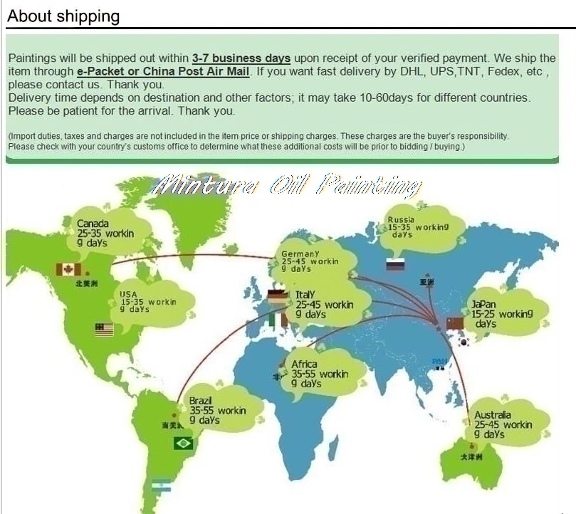 В: Что мне делать, если я не получил свою покупку?О: если вы не получили свою покупку, проявите терпение. Ваша покупка может быть доставлена вам в течение нескольких дней. Между тем, пожалуйста, свяжитесь с транспортной компанией или свяжитесь с нами для получения помощи, мы постараемся сделать все возможное, чтобы помочь вам. Если ваша покупка была утеряна, мы повторно отправим вам новый товар.В: Что мне делать, если картины, которые я купил, не понравились?О: пожалуйста, не стесняйтесь обращаться к нам через веб-почту платформы или по электронной почте, мы решим любые проблемы с вами. Мы рады помочь вам обменять другие, но покупатели несут ответственность за все транспортные расходы.В: почему у вас такие низкие цены?О: у нас много талантливых и мастер-художников, мы покупаем напрямую тысячи картин высокого качества. У нас есть Непревзойденная способность приобретать картины по низкой цене, и вместо увеличения прибыли мы передаем сбережения нашим клиентам. Покупка у нас дает вам возможность приобрести картины маслом по оптовой цене.В: так как товар нужен мне срочно, у вас есть способы доставки на ночь?О: как правило, мы отправляем картины в течение 2-7 дней после подтверждения оплаты, вы можете сообщить нам, если они вам нужны срочно, затем мы постараемся выбрать для вас ночной способ доставки. Но мы не уверены, что товар прибудет вовремя, так как международные перевозки трудно контролировать.В: вы можете настроить изображение?О: Да, если у вас есть особые пожелания, свяжитесь с нами.В: Могу ли я получить скидку?О: обычно у нас есть скидки каждые несколько месяцев, вы можете поместить понравившиеся товары в корзину и Добавить в список желаний, подождите, пока система проинформирует Вас о скидке.В: вы предлагаете оптовую цену?О: Да, если вы хотите заказать много штук вместе, вы можете связаться с нами, и мы проверим, какую скидку мы можем предложить.