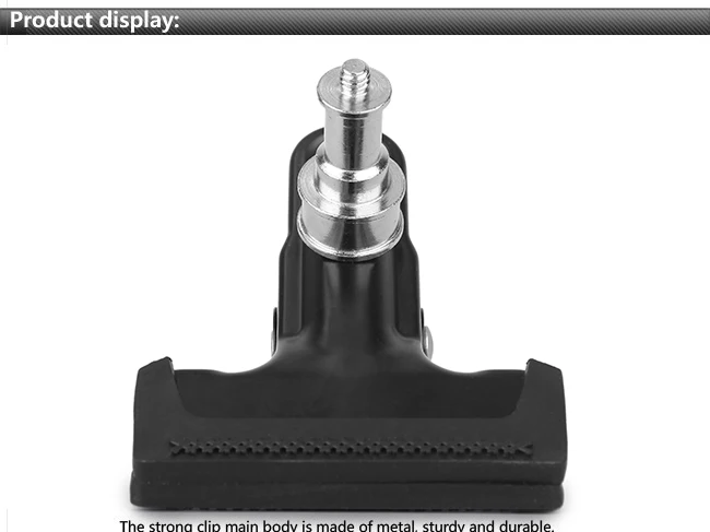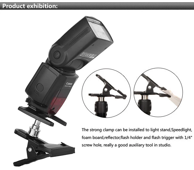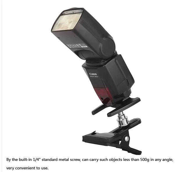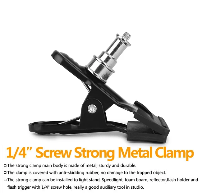 Крепкий зажим может быть установлен на осветительную подставку, Speedlight, пенопластовую доску, отражатель, держатель вспышки и триггер вспышки с винтовым отверстием 1/4 ", действительно хороший вспомогательный инструмент в студии.Встроенный 1/4 "стандартный металлический винт, может переносить такие предметы менее 500 г под любым углом, очень удобно в использовании. Прочный зажим основной корпус изготовлен из металла, прочный и прочный. Зажим покрыт противоскользящей резиной, не повреждает попавший в ловушку предмет.Технические характеристики:Цвет: черный цветМаксимальная нагрузка: 500 гМатериал: металлВес: 150 г