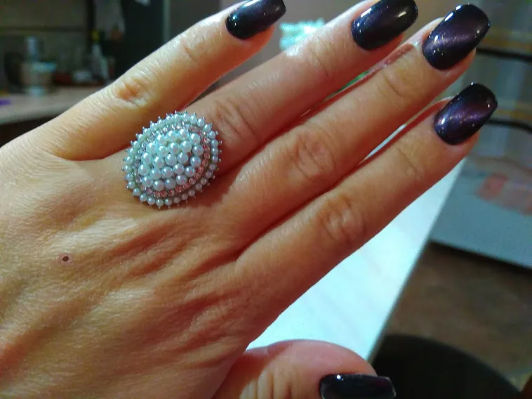 кольцо очень красивое. все камушки ровно приклеены. клея не видно. блестит)))) размер регулируется, но метал сам не очень прочный. вцелом очень довольна. дошло в Украину быстро 2,5-3 недели новой почтой, - заказывала платную доставку. упаковано в полиэтилен