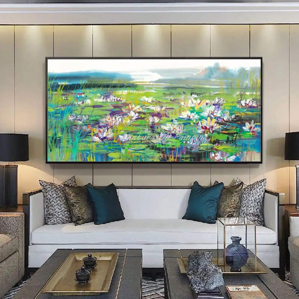 Бесплатная доставка 100% ручная роспись высокий Q. Цветок лотоса настенный художественный пейзаж, картина маслом на холсте для гостиной украшение дома