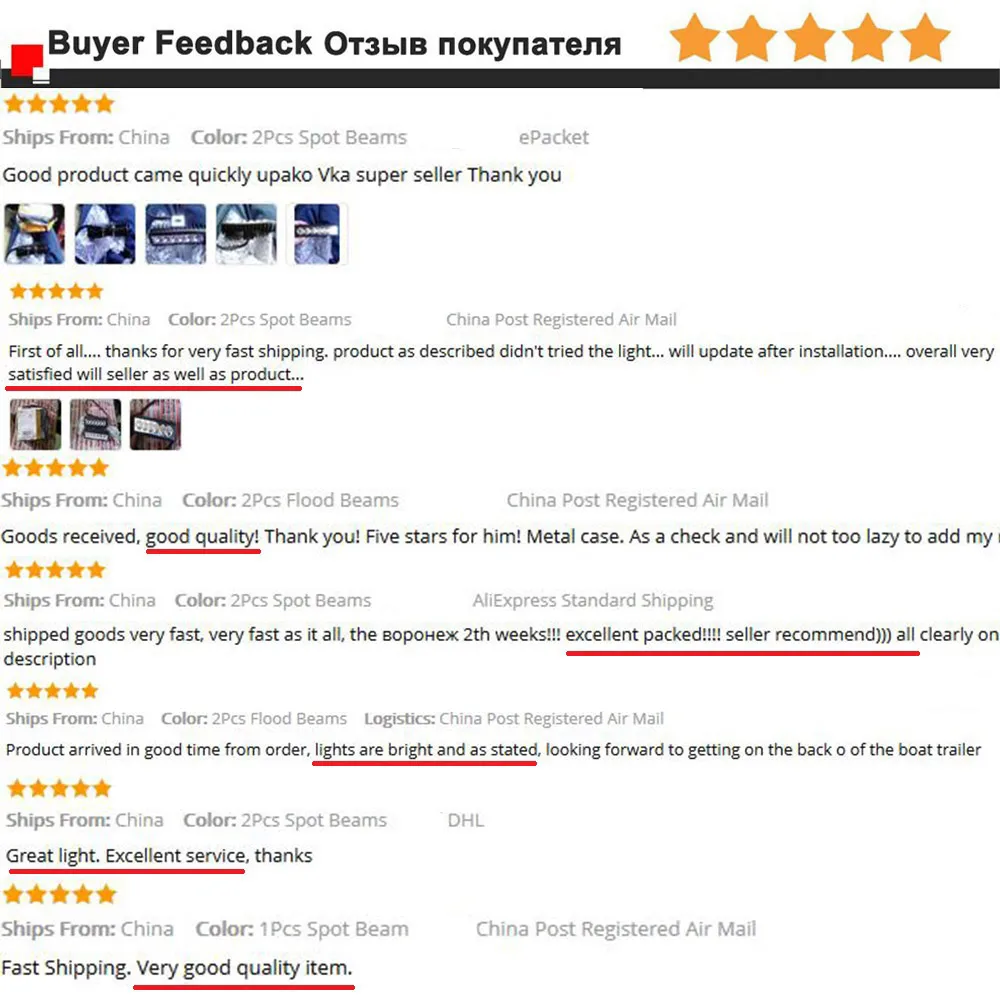 пришел быстро. в одном комплекте не хватало крепления (болт м8+шайба+гайка) - открыл спор - продавец вернул 1$. думаю необходима дополнительная обработка герметмком стекла и провода. включил проверил - светит достаточно хорошо, на авто пока еще не устанавливал