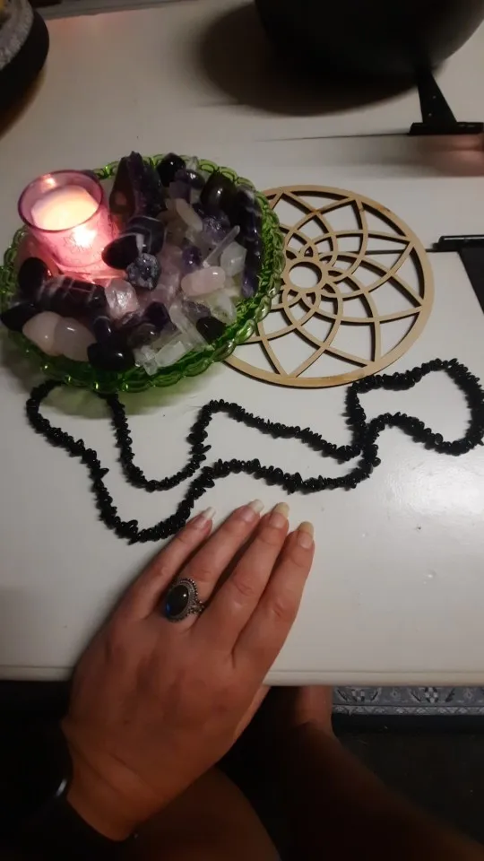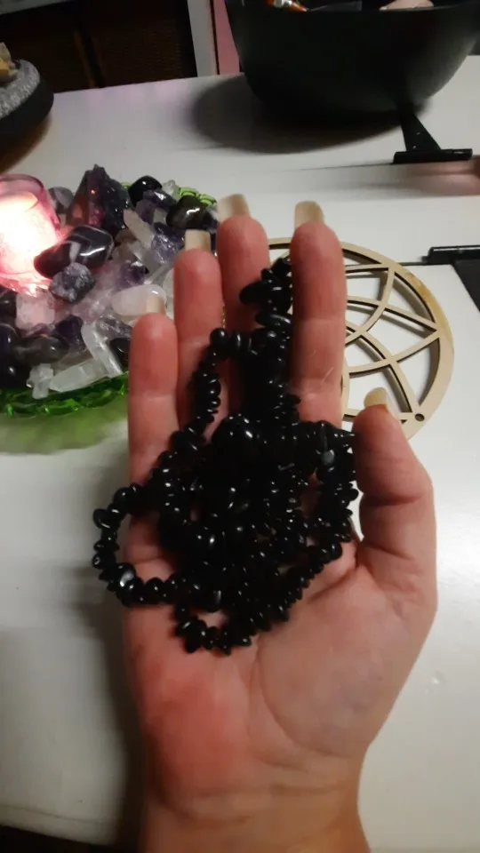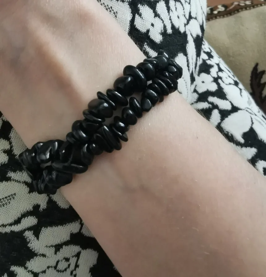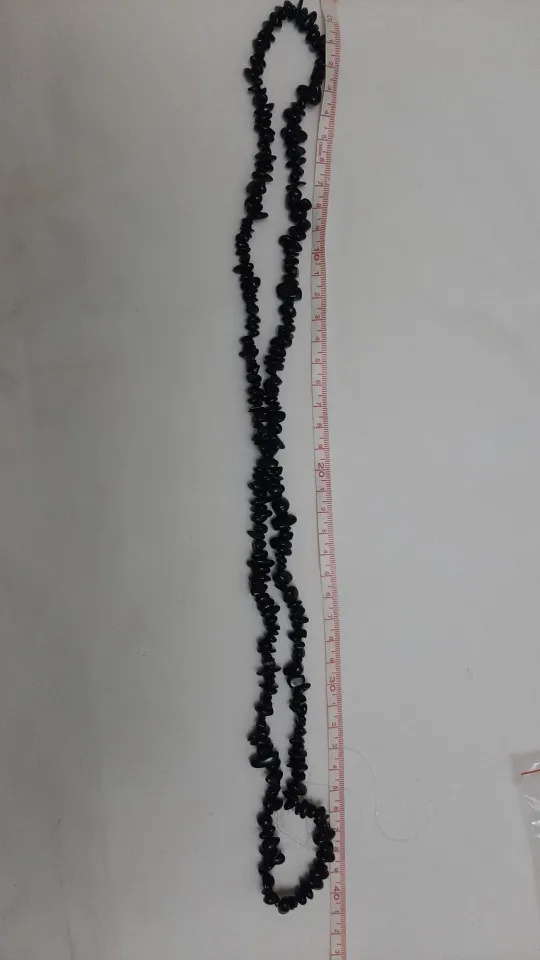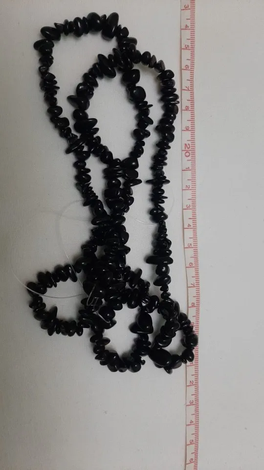 похоже на натуральный камень турмалин. проверяла....волосинку притягивает, внутри тоже черный, а не как некоторые пишут крашеная галька. Покупкой довольна до этого брала у нас них же браслет.Не поняла почему застёжка отдельно от бус? А так мне понравилось.