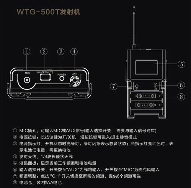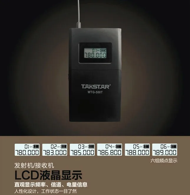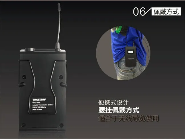 Беспроводная система туристического гида Takstar WTG-500, частота УВЧ, 6 выбираемых каналов, рабочий диапазон 100 м, 1 передатчик + 20 приемников