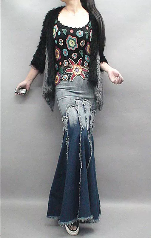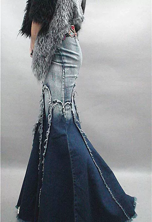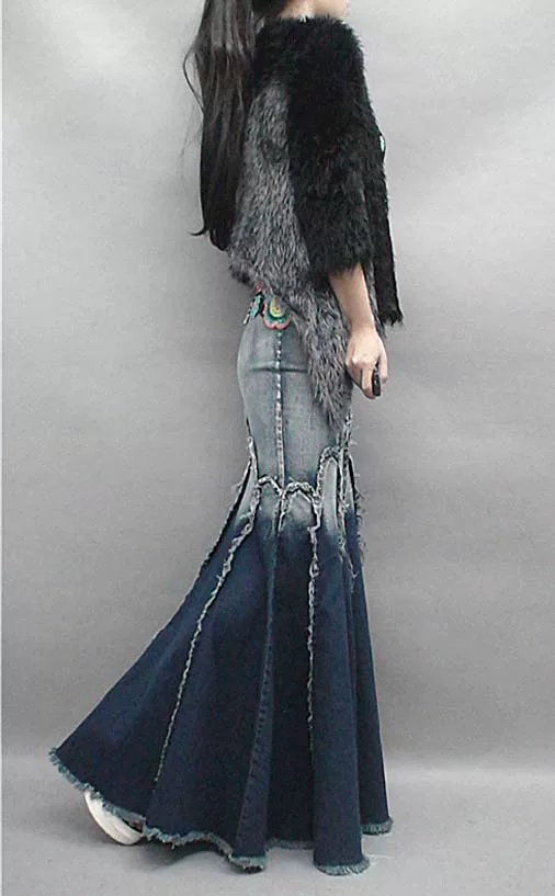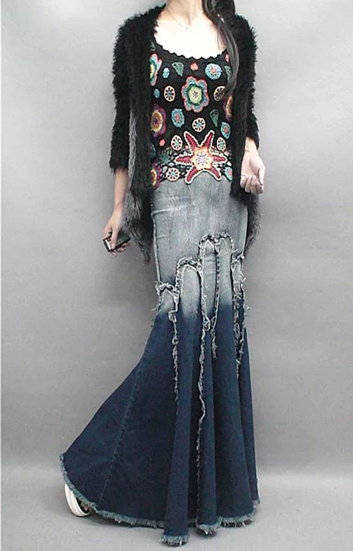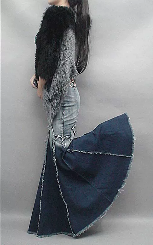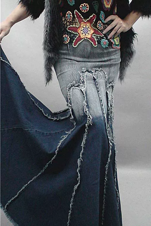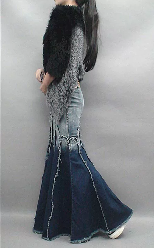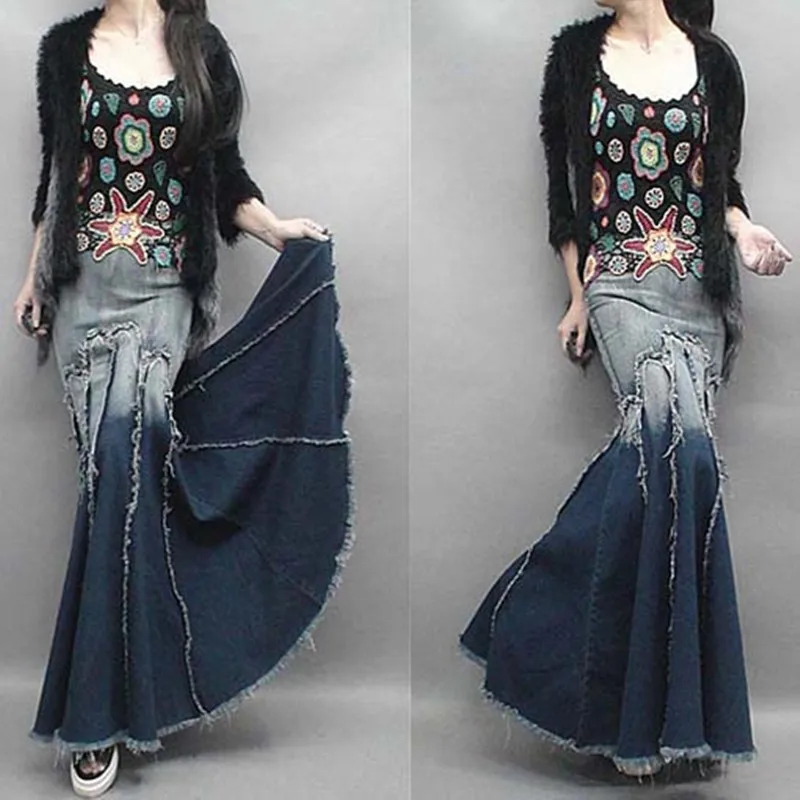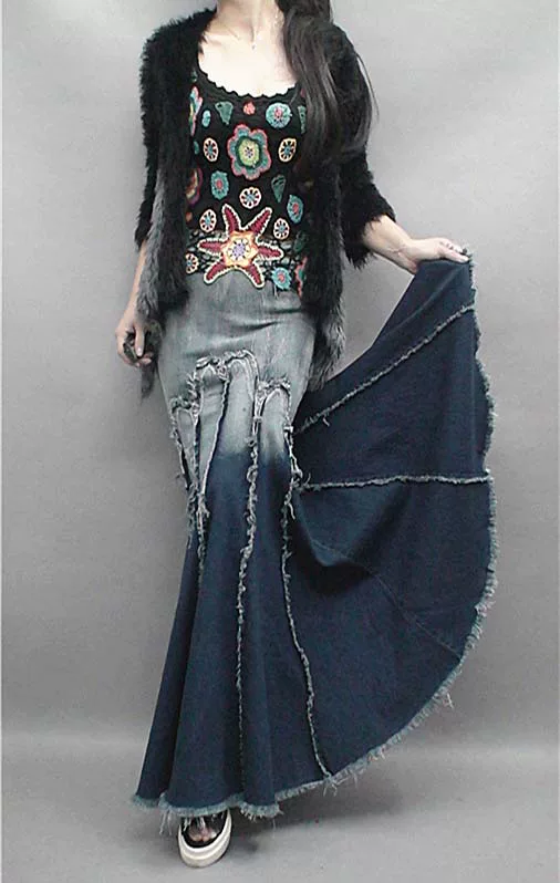Женские джинсовые юбки в пол, длинные юбки из денима с кисточками в стиле русалки, большие размеры, 2019