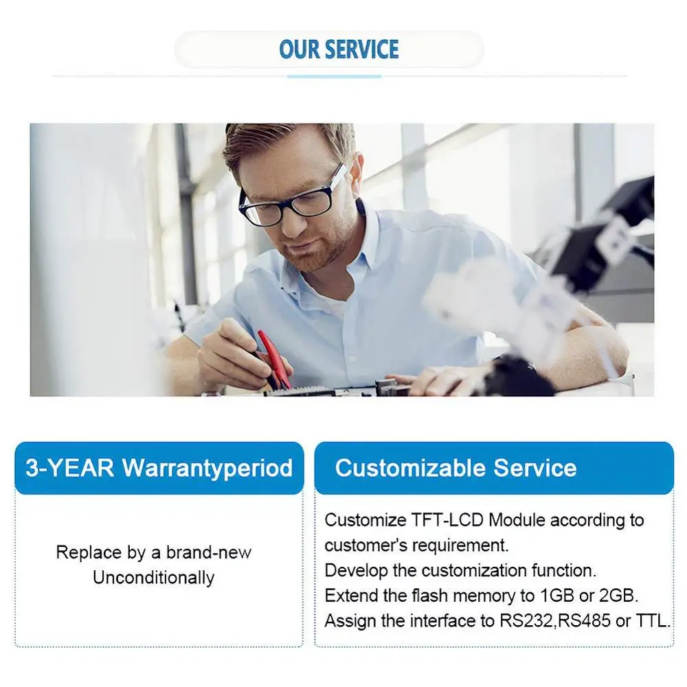 1. Включает ли ваш продукт программное обеспечение? О: Да. В комплект входит бесплатное графическое программное обеспечение для интерфейса пользователя. 2. Как вы программируете дисплей? О: нам не нужно писать какой-либо код для дисплея или программы драйвера. Наш набор дисплеев включает ЦП и память, вы можете использовать напрямую. Файл jpg для создания графического интерфейса и использования его для отправки набора команд HEX для связи с Вашим блоком микроуправления. 3. Какой интерфейс у этого дисплея? О: набор дисплеев использует последовательный порт UART (RS232/RS485/TTL) для связи с любым типом MCU с помощью наборов команд HEX. 4. Может ли дисплей воспроизводить видео/аудио файлы? О: Да. Основной набор дисплеев имеет 128 Мб памяти, и вы можете хранить любые видео/аудио файлы в нем. Дисплей может воспроизводить файлы напрямую. 5. Вы используете резистивный сенсорный или емкостный сенсорный дисплей? О: у нас есть резистивный сенсорный, емкостный сенсорный и не сенсорный дисплей. 6. Что еще мне нужно для использования этого набора дисплея? О: мы предоставляем кабель, конвертер, программное обеспечение и руководство. Вам просто нужен ПК с системой windows и блок питания 12 В постоянного тока для работы с дисплеем. 7. Я не знаю, как создать графический интерфейс или связаться с моим устройством. Где я могу получить помощь? О: мы предоставляем специальное руководство на английском языке и руководство по разработке для вас. Вы можете получить любые знания, необходимые для разработки. Вы также можете проверить наш канал YouTube для видео-инструкций или напрямую связаться с нашим отделом продаж, чтобы получить помощь. 8. Что делать, если дисплей был сломан или сбой? О: мы предоставляем 3 года безусловной гарантии для нашего I-serial и серийного дисплея, 1 год безусловной гарантии для C-serial display. Вы можете получить бесплатную замену, если ваш дисплей был поврежден или сбой.