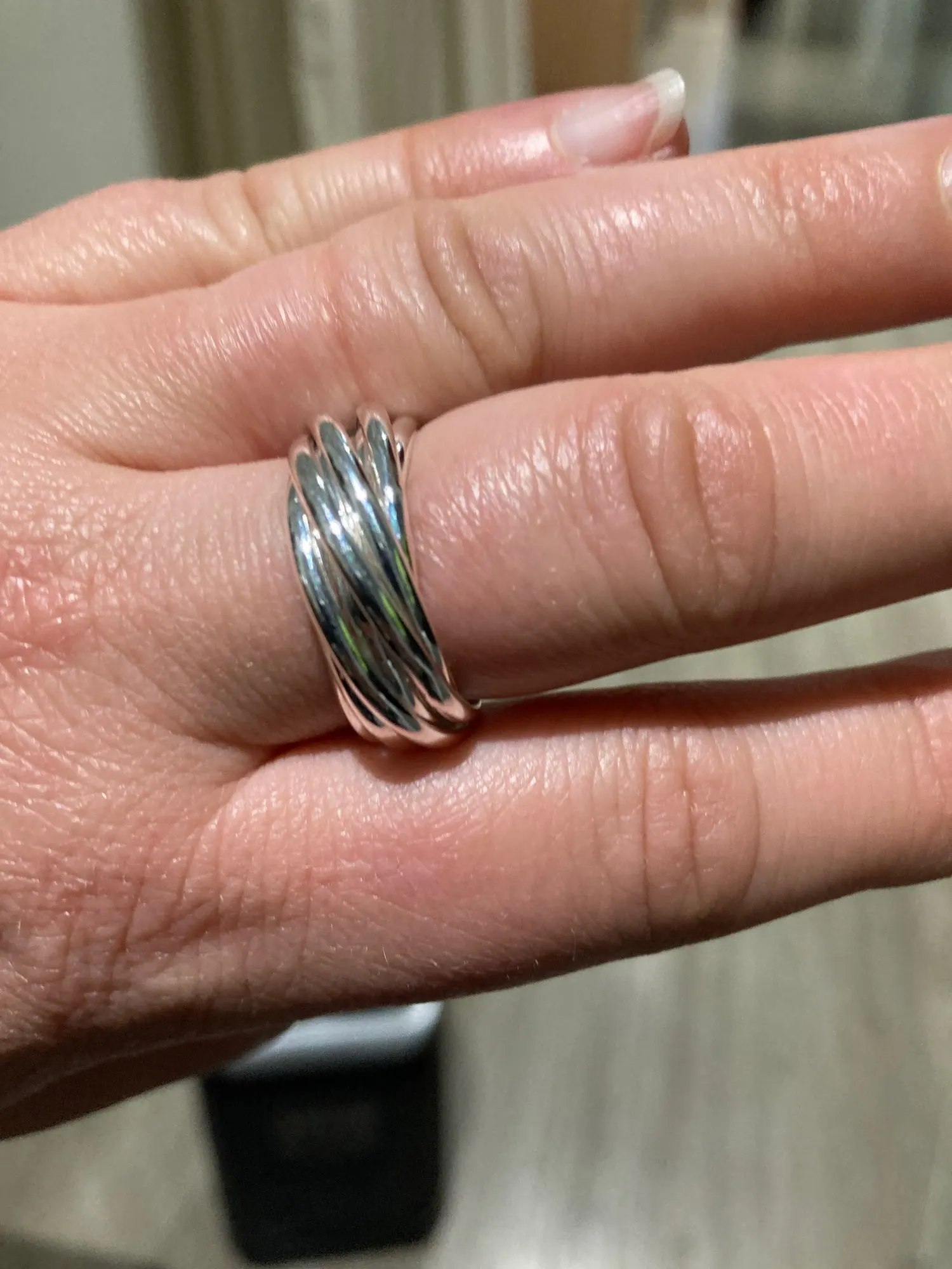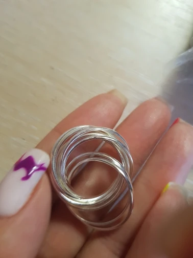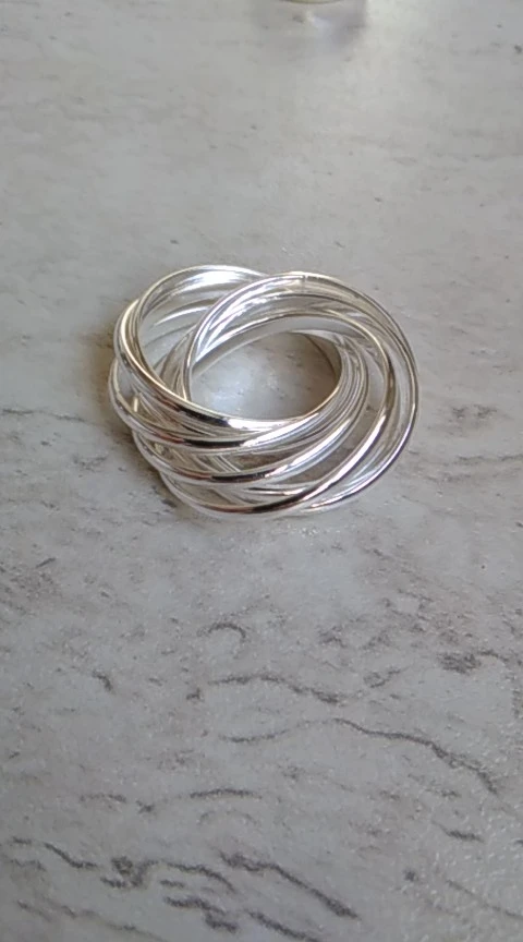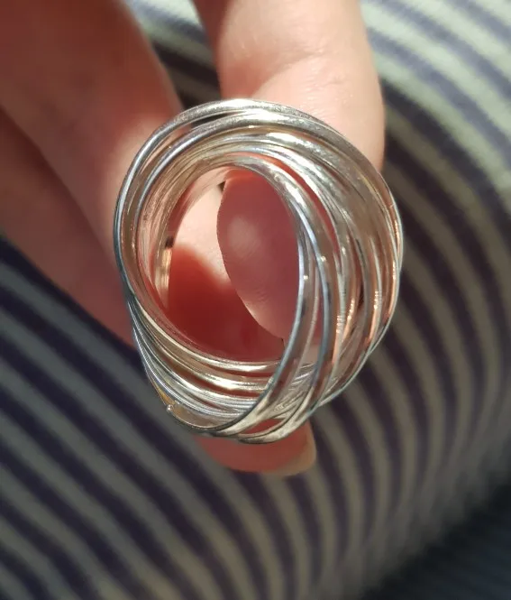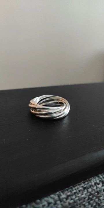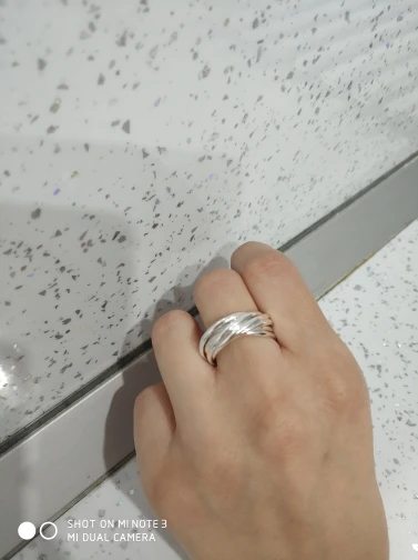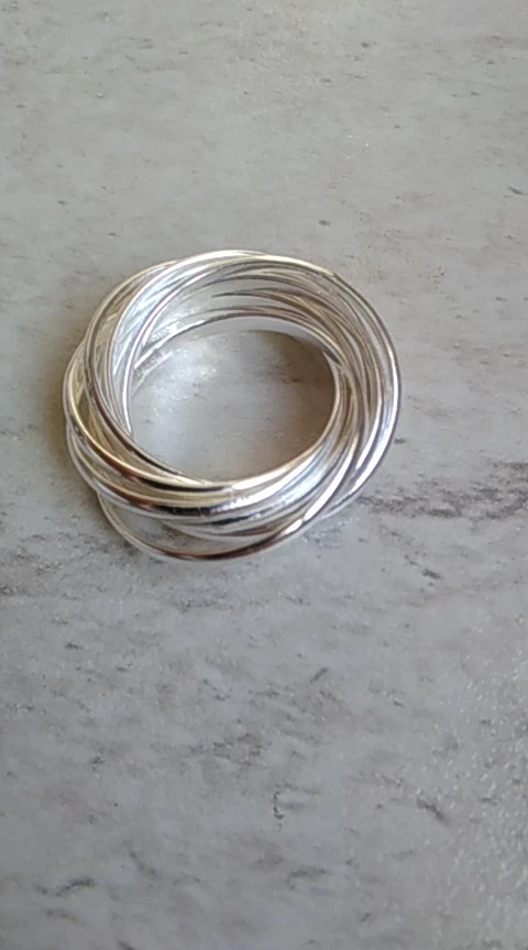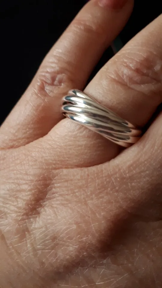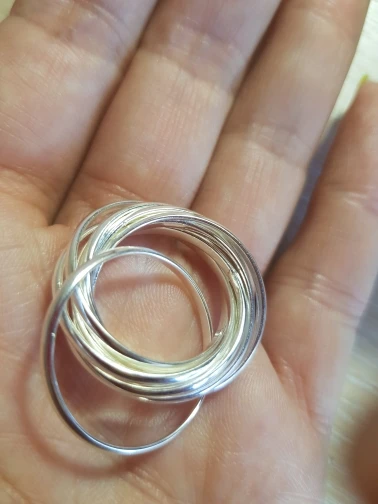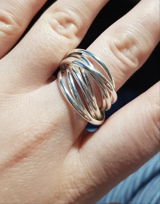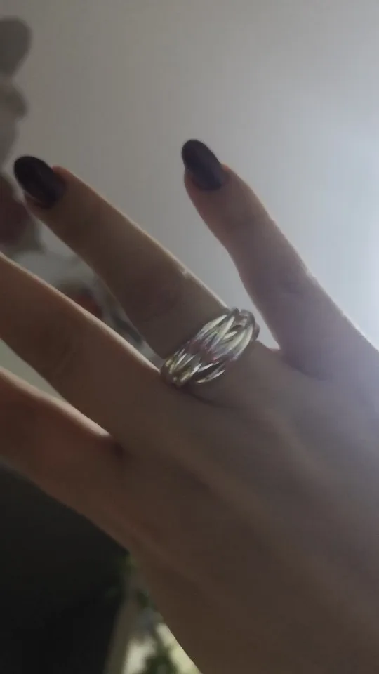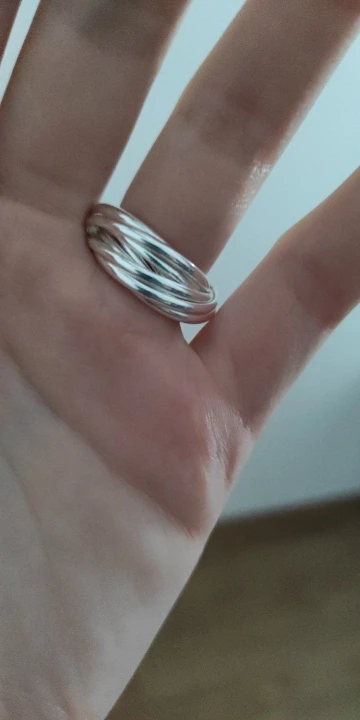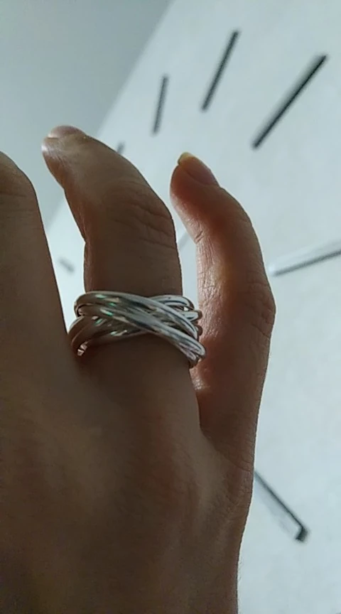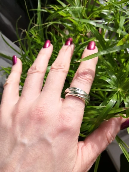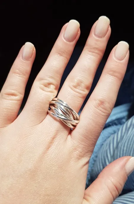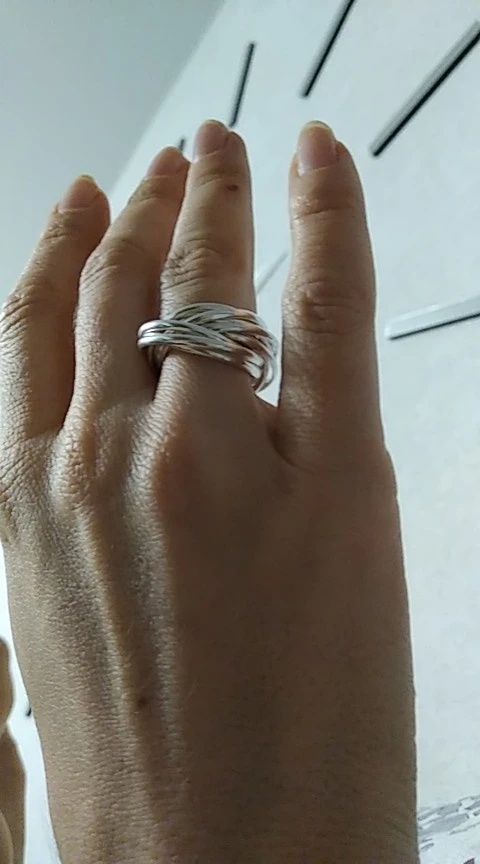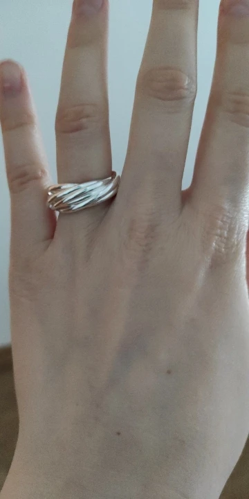 Каждое из колечек тонкое, на каждом присутствует спайка с внутренней стороны,мне это очень не нравится хоть в глаза и не бросается. В целом смотрится красиво. 8 достаточно большой размер, на тонкие пальчики, вероятно, будет великовато.