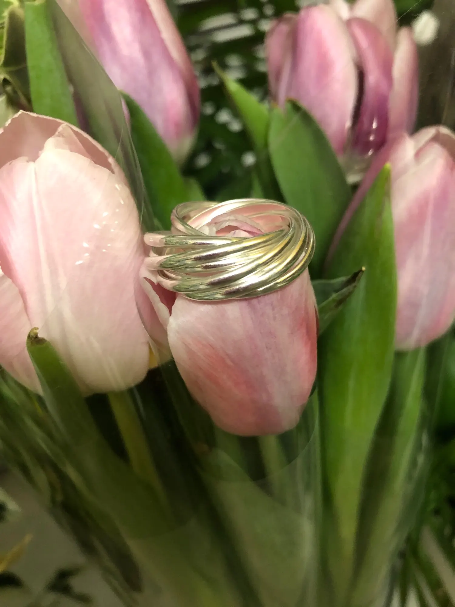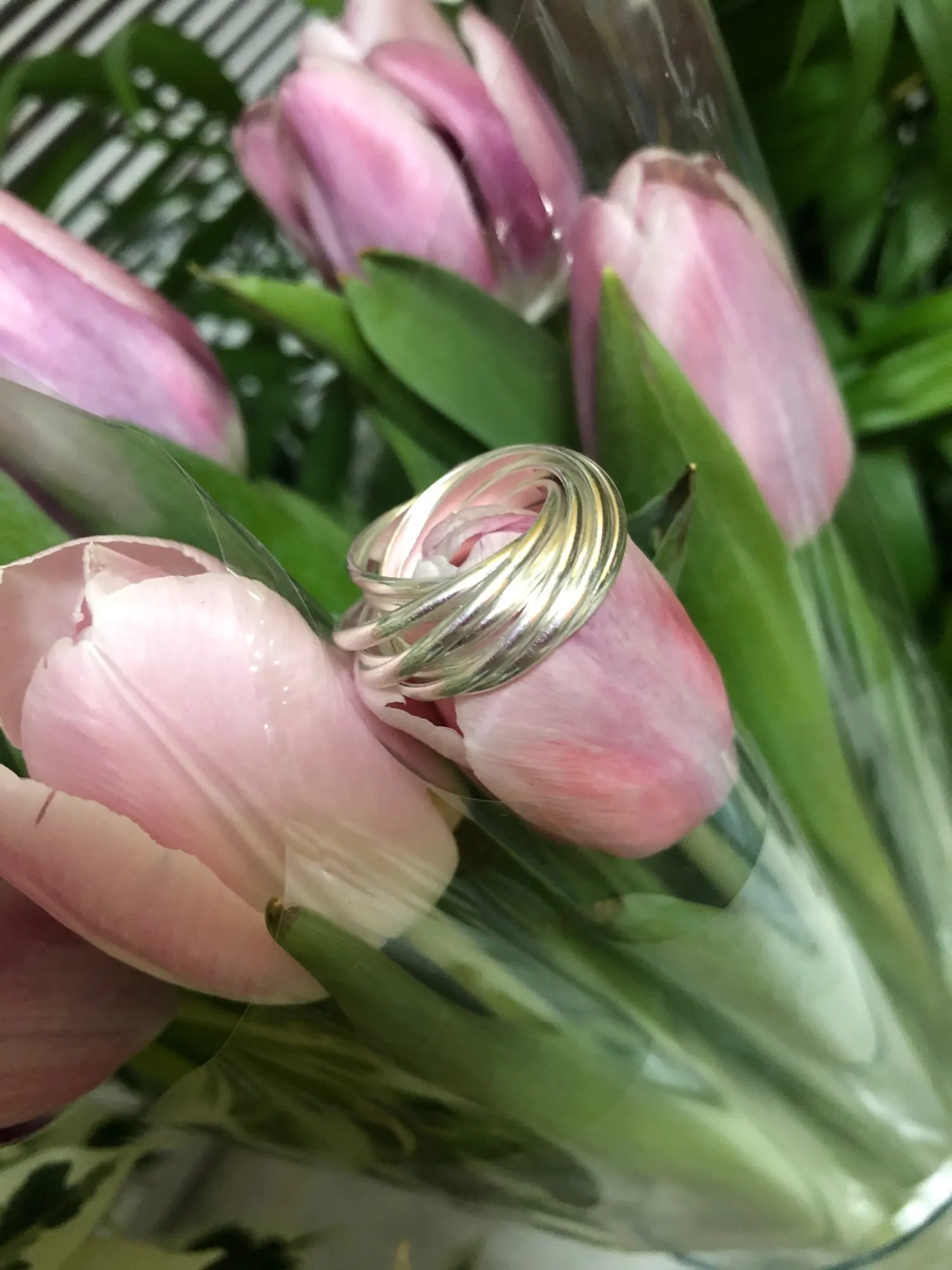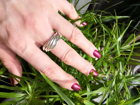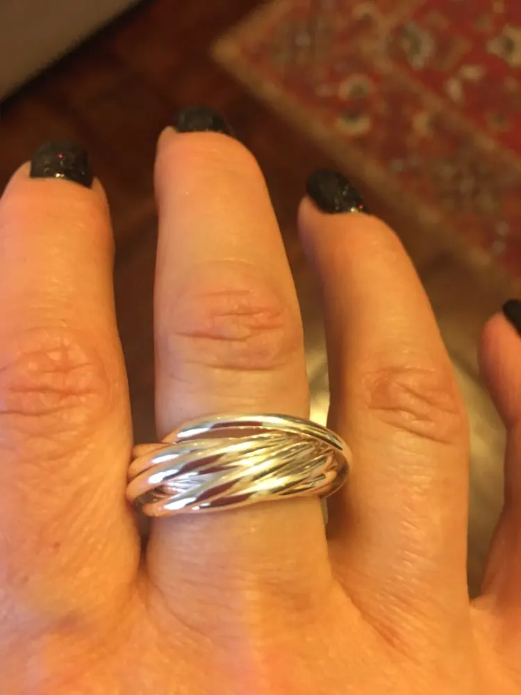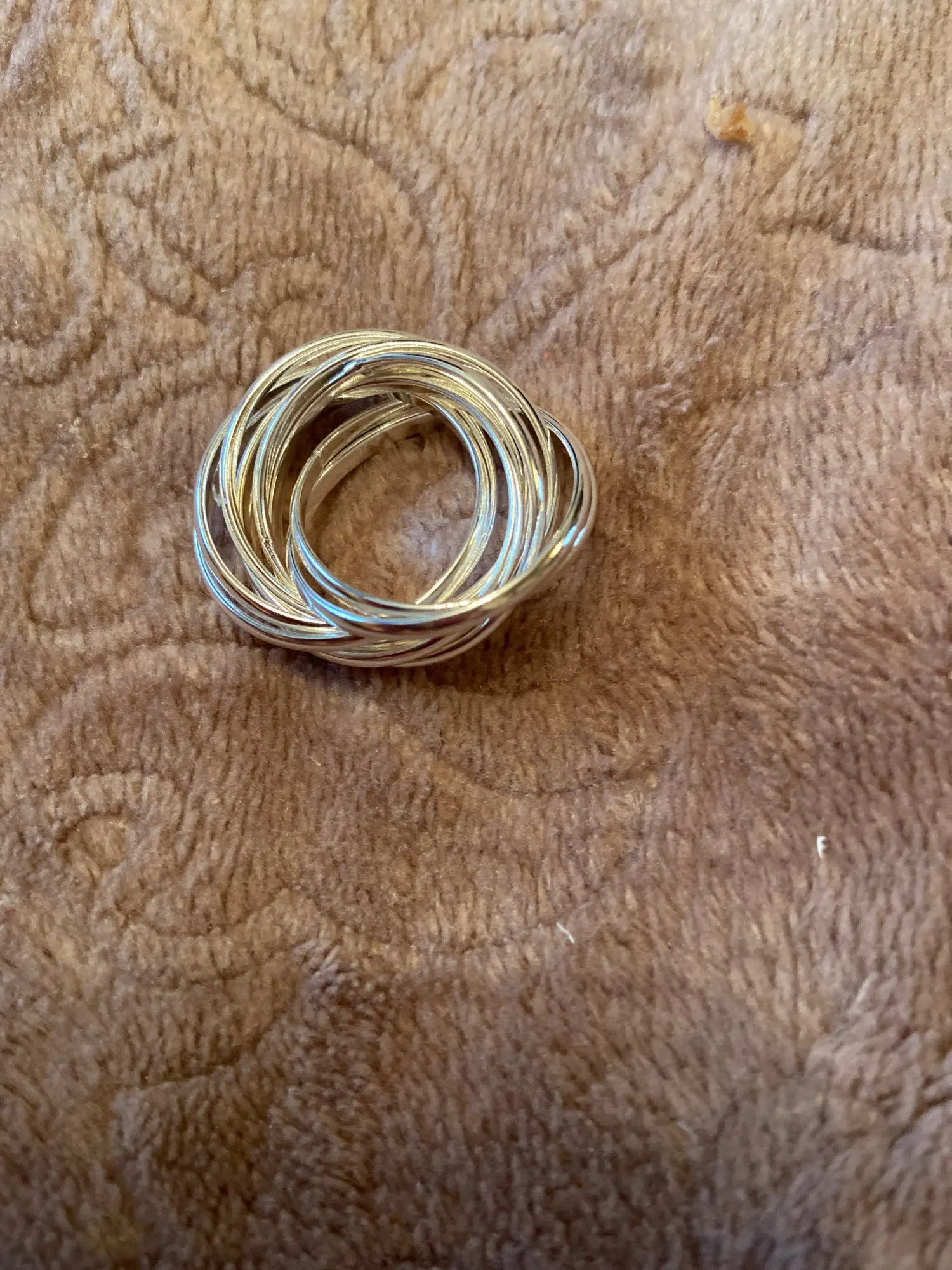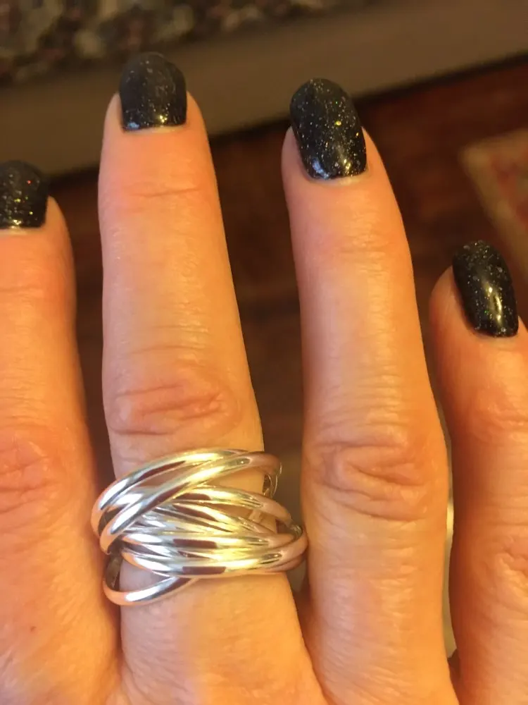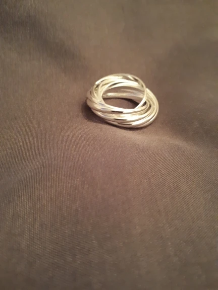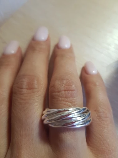 Каждое из колечек тонкое, на каждом присутствует спайка с внутренней стороны,мне это очень не нравится хоть в глаза и не бросается. В целом смотрится красиво. 8 достаточно большой размер, на тонкие пальчики, вероятно, будет великовато.