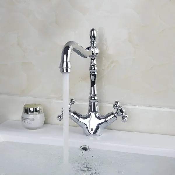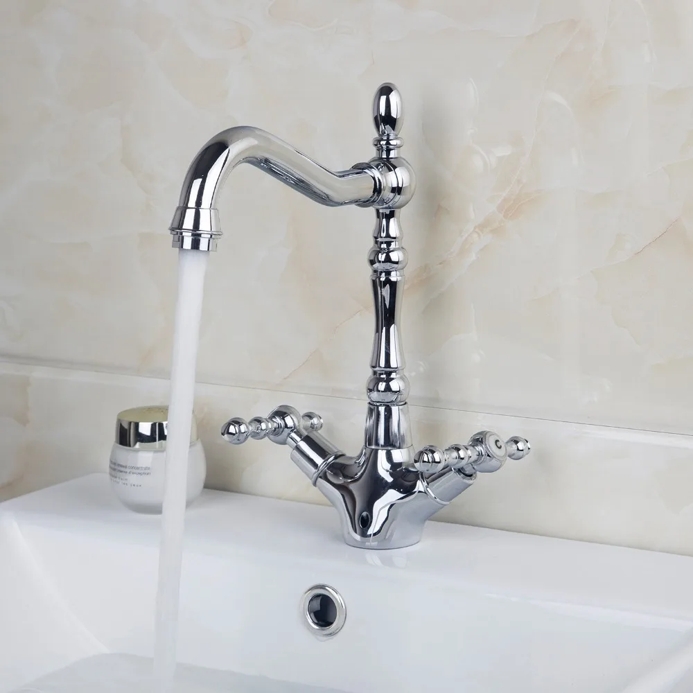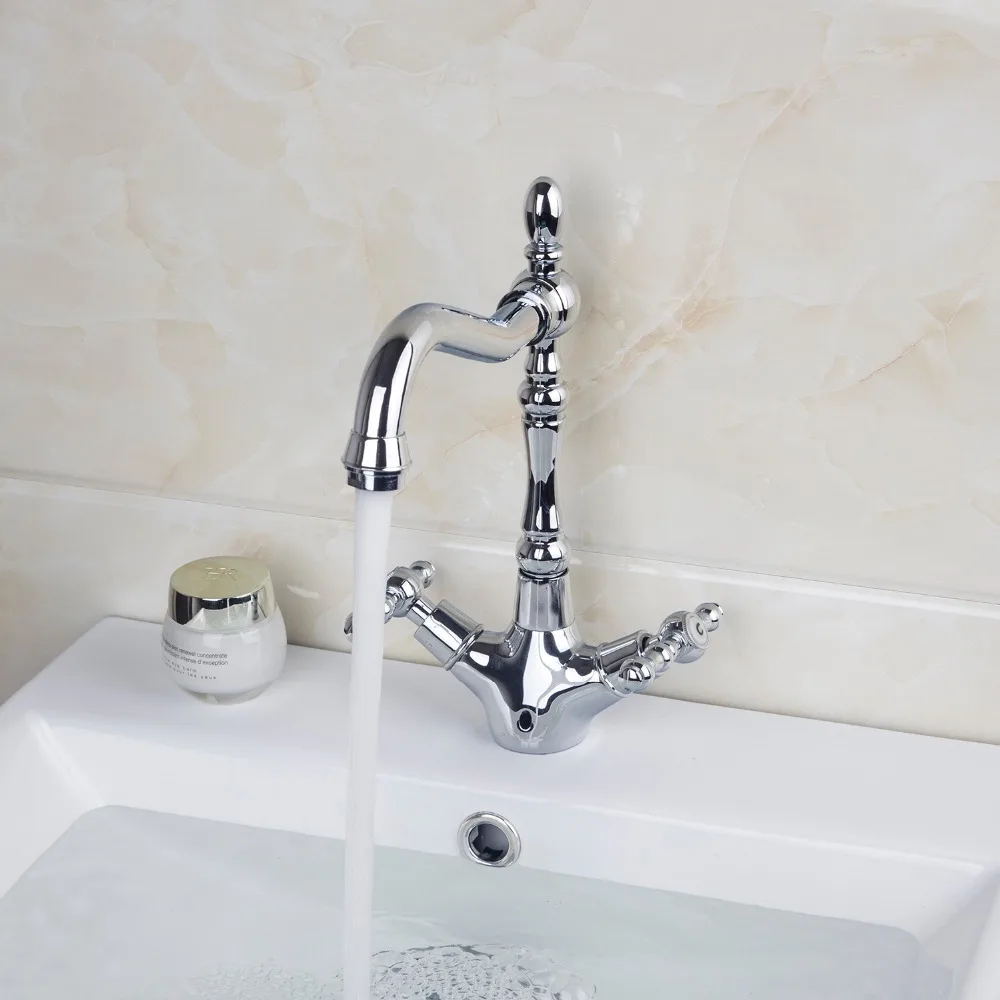 Смеситель для ванной KEMAIDI, полированный хром, 2 ручки, поворотный кран смеситель горячей и холодной воды, латунный Смеситель для раковины, смеситель для раковины в ванной