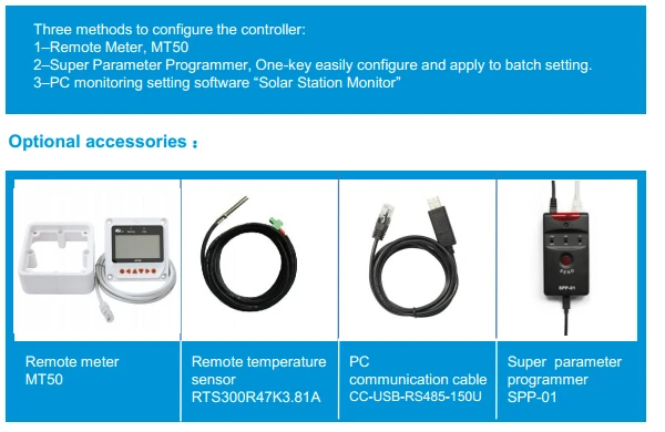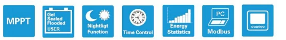 Особенности: Инновационный со слежением за максимальной точкой мощности технологии Максимальная эффективность преобразования 98% Высокая эффективность отслеживания до 99% Несколько секунд скорость отслеживания Литой алюминиевый дизайн и естественное охлаждение Температура компенсация Разнообразный контроль нагрузки для удовлетворения различных требований Четыре варианта типа батареи: герметичный, ГЕЛЕВЫЙ, затопленный и пользовательский Интеллектуальное управление освещением и таймером для системы солнечного освещения Функция СТАТИСТИКА ЭНЕРГЕТИКИ Порты RS485 с протоколом MODBUS Дополнительное программное обеспечение для мониторинга ПК и дистанционный счетчик для контроля в реальном времени и настройки параметров управления батареей Поле обновляемое встроенное программное обеспечение