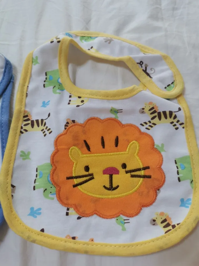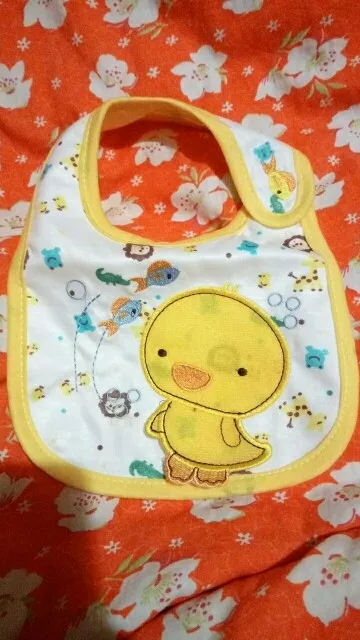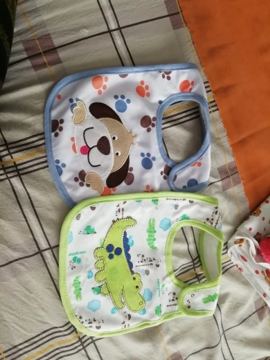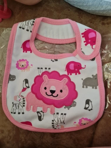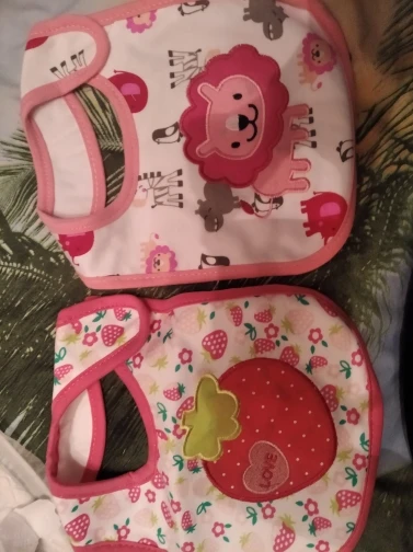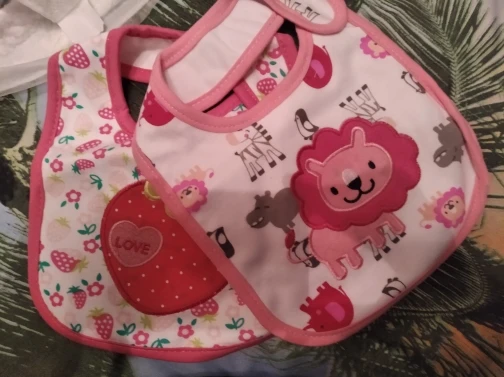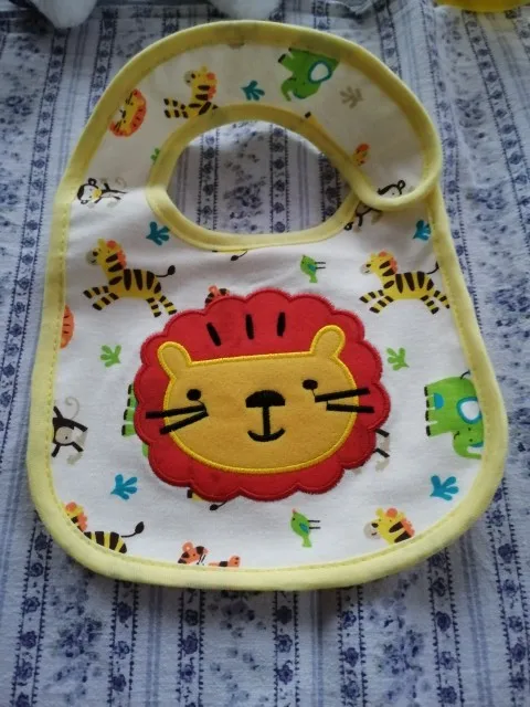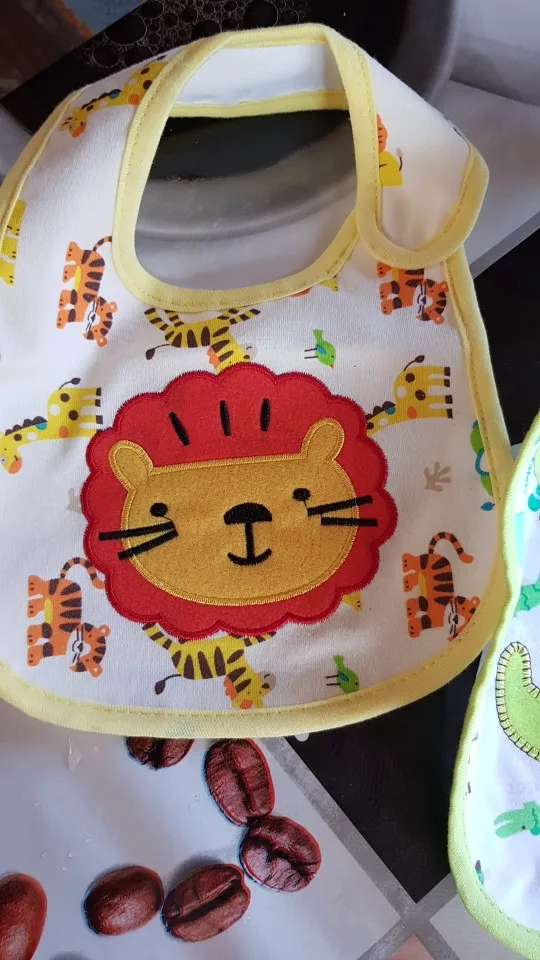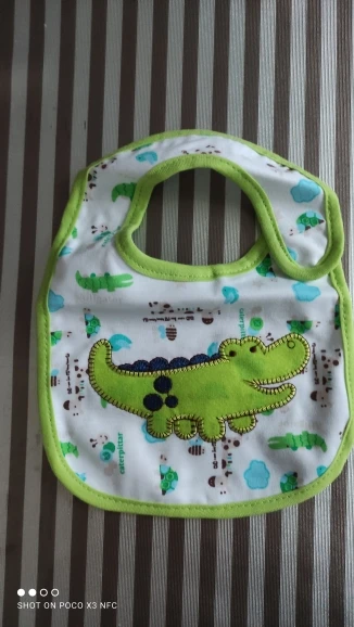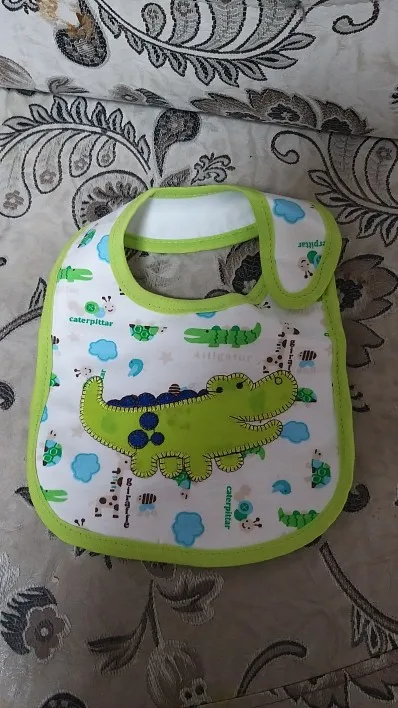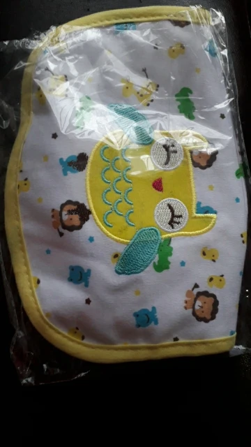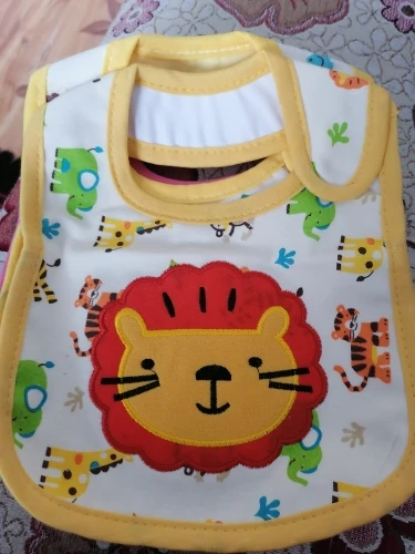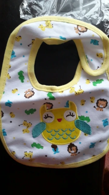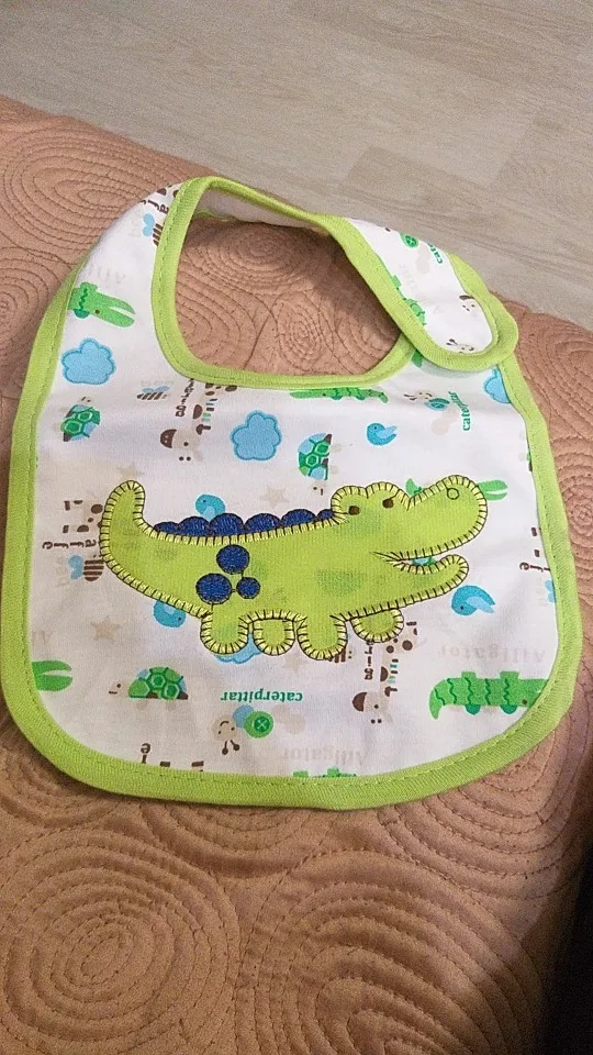 крутой слюнявчик, прям качественный, не промокает,сам слюнявчик двойной, внутренний материал изнутри клеенчатый, а стороной к малышу хлопковый, верхний материал хлопковый. Пришёл быстро в объединенной посылке. Брала за 1.49 доллара.