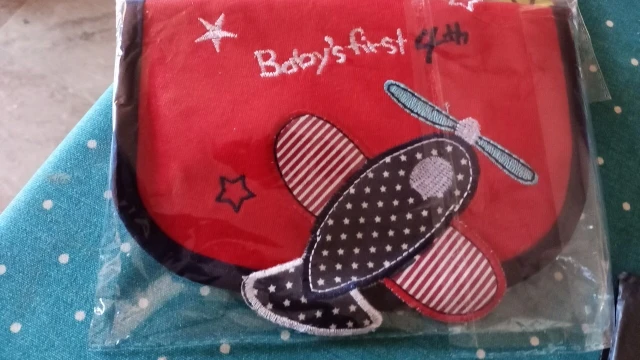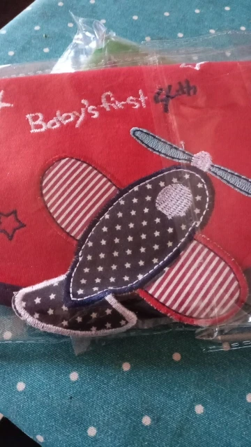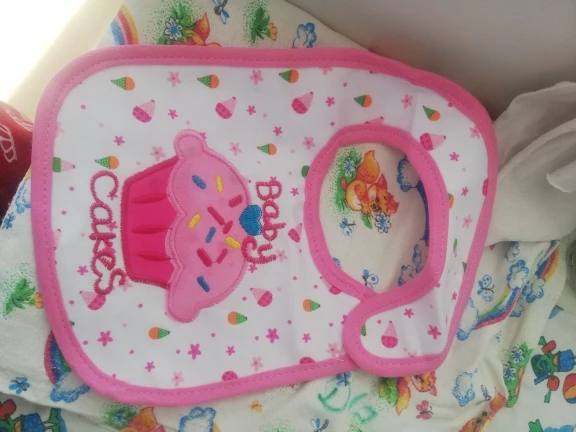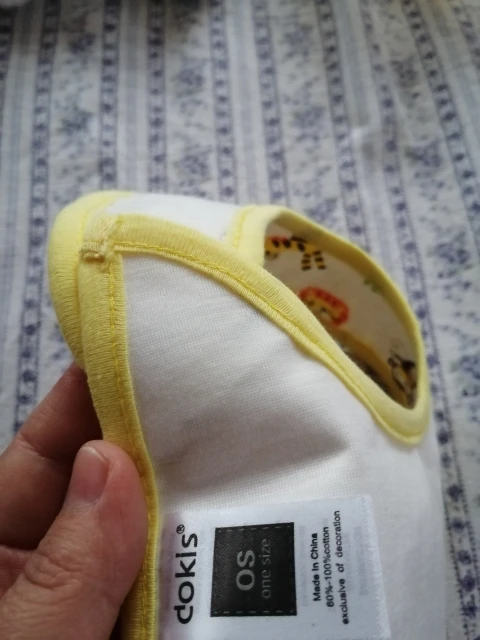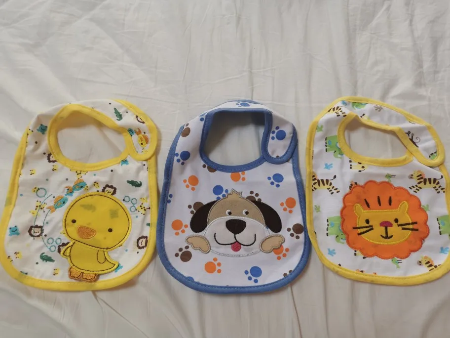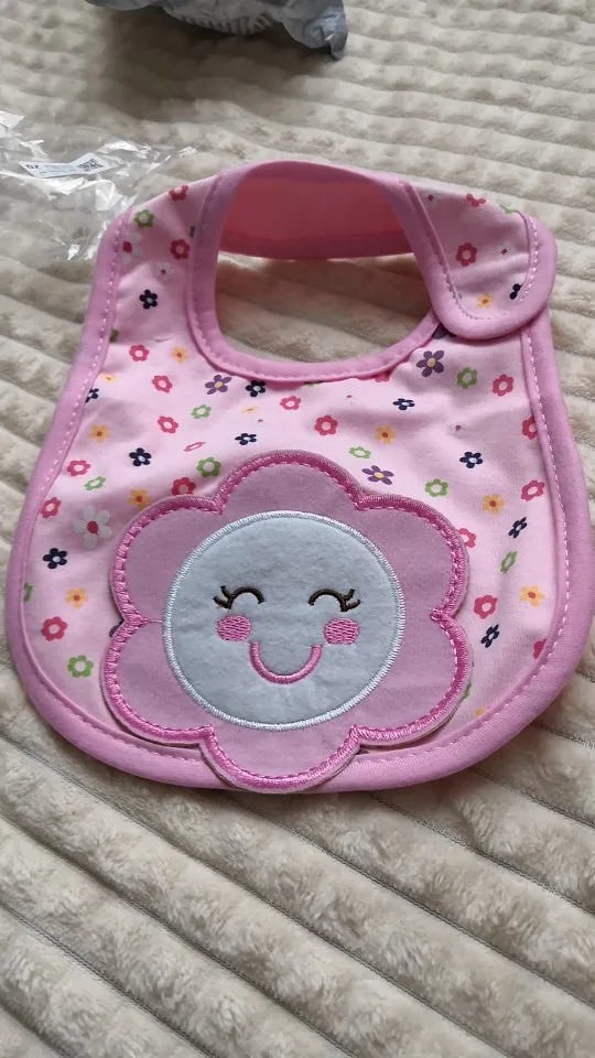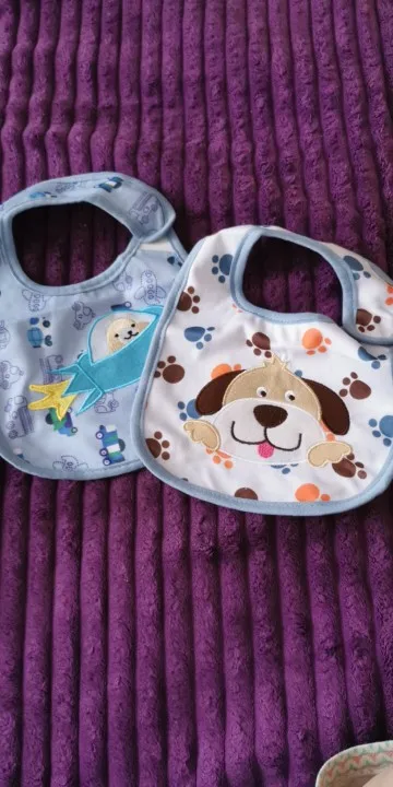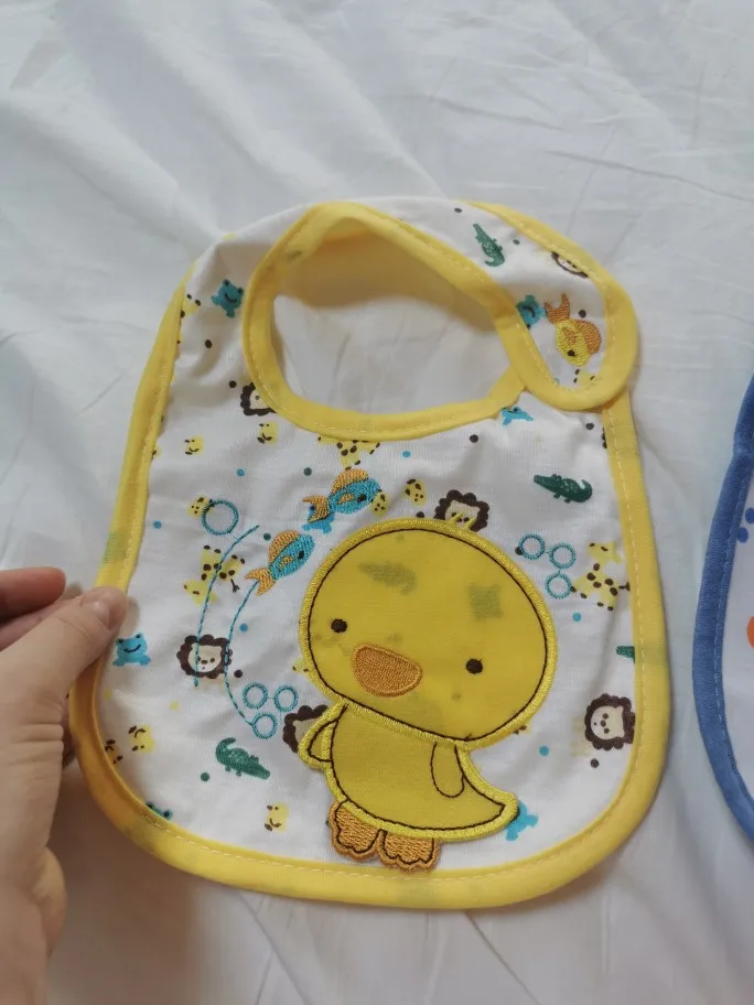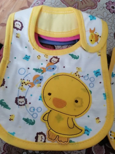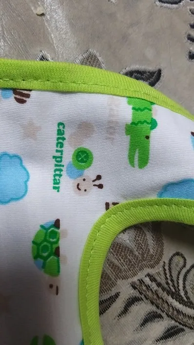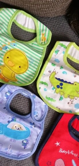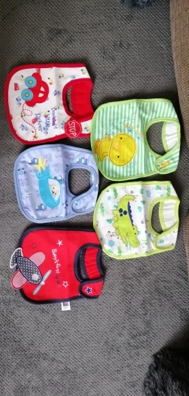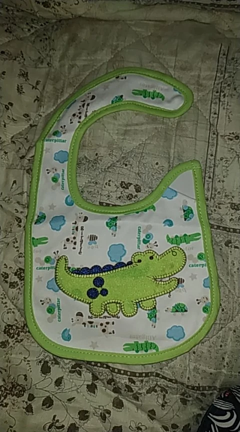 крутой слюнявчик, прям качественный, не промокает,сам слюнявчик двойной, внутренний материал изнутри клеенчатый, а стороной к малышу хлопковый, верхний материал хлопковый. Пришёл быстро в объединенной посылке. Брала за 1.49 доллара.