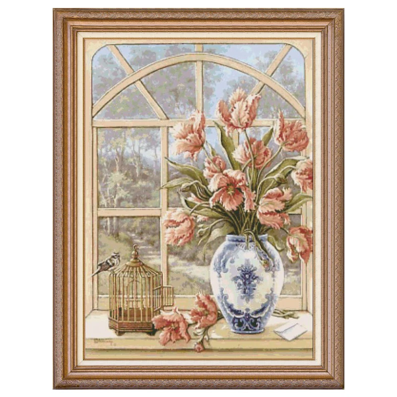 Бесплатная доставка, Лидер продаж, высококачественный Набор для вышивки крестиком, подоконник, Мак, цветок, птица, окно