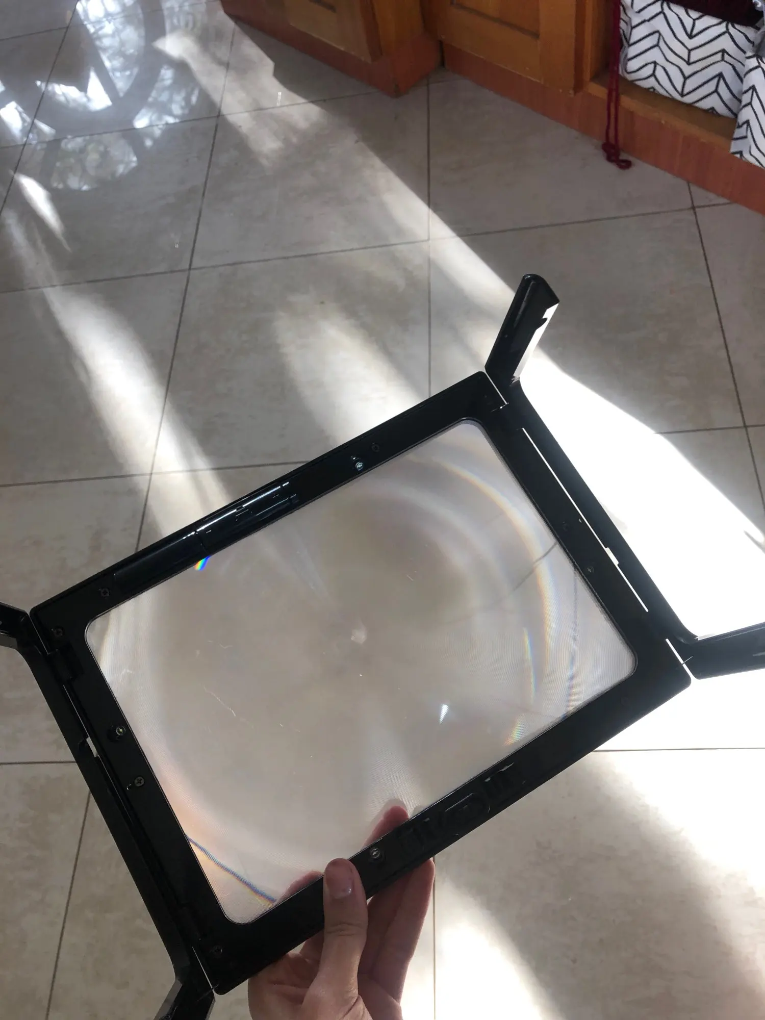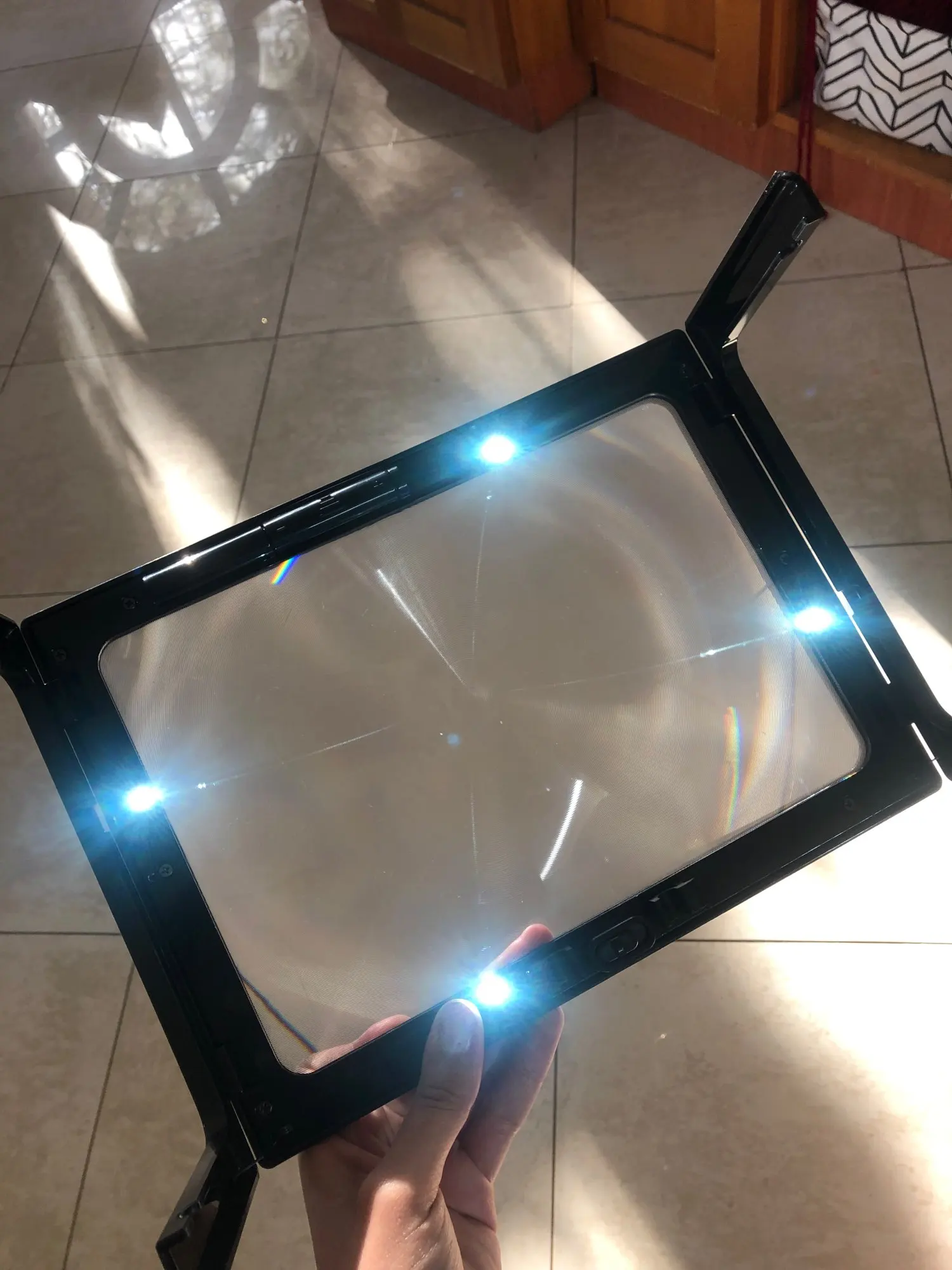 Очень быстрая доставка, материал оргстекло, так что при падении не разобьётся, подсветка от двух ААА батареек. Увеличивает хорошо, пользоваться удобно.