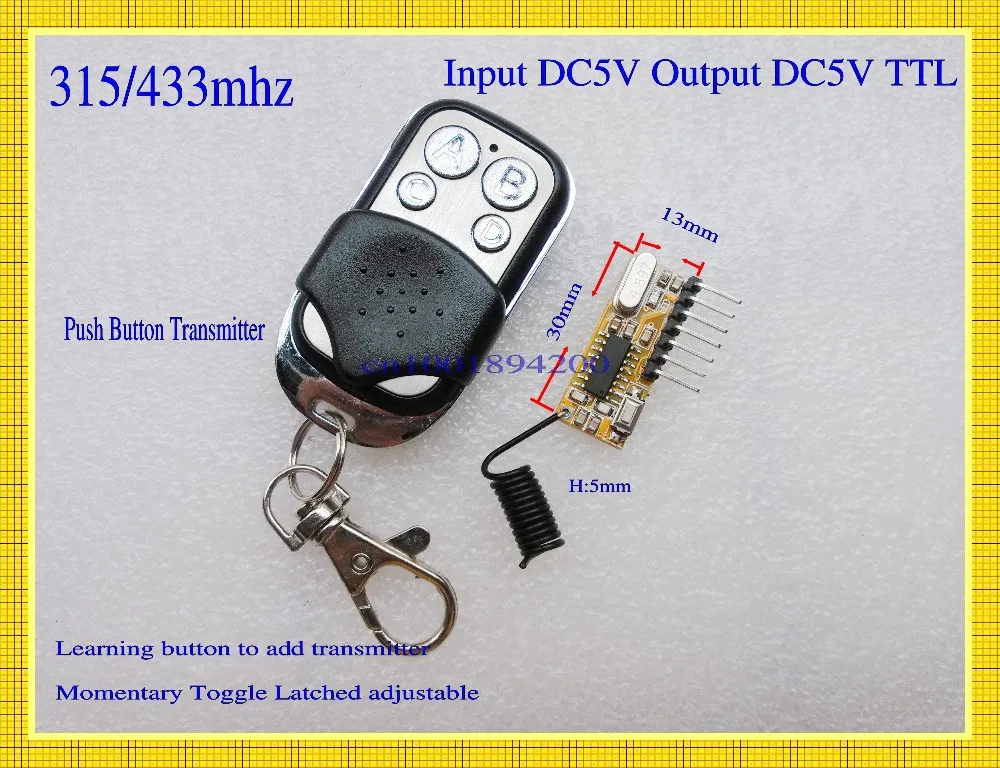 Это отличный модуль UHF rolling code, он был использован передовой РЧ интегральной схемы и с мертвым надежным алгоритмом шифрования KEELOQ, конструкция цепи особенная и Стабильная и надежная. Сильный отказ от помех может быть использован в любом виде severeenvironment и высокий безопасный и надежный случай. Потому что в комплект входит Схема кодирования. Его можно использовать непосредственно в любой беспроводной системе дистанционного управления гаражной дверью. Любая система сигнализации, система контроля доступа и любая другая Беспроводная система дистанционного управления, промышленный дизайн.