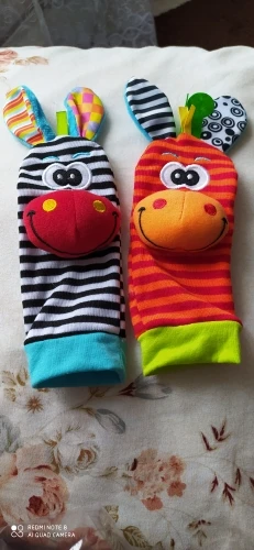 Это просто милота! Яркие цвета, носочки без пятки и подходят на любой размер ножки, браслетики с крепкими липучками, качество отличное, как из ДМ, никакого запаха. Ушки у зверюшек шелестят, в мордочках вшиты бубенчики, звук у них приглушённый. Малышу 2,5 месяца ещё не понял их, а я уже умиляюсь Носочки с браслетами вышли за 274 руб. До Нижнего Новгорода товар шёл почти месяц, заказала 13.11.20, доставлен 09.12.20. Продавца рекомендую!