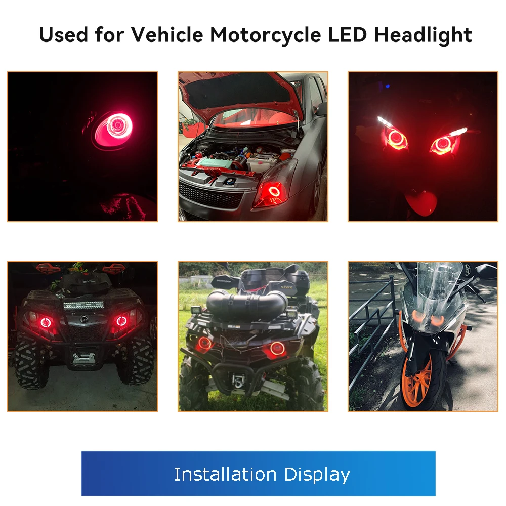 > Применение: ангельские глазки, противотуманные фары, светодиодный фонарь, подходит для автомобиля, автомобиля, мотоцикла, скутера.