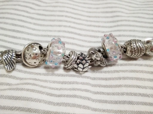 Доставка быстрая, шишечка очаровательная, в подарок мешочек - приятно. Сделана очень аккуратно и ровненько, на внутренней стороне чешуек чернение. Штамп присутствует. Фото для сравнения размеров с другими шармами. Спасибо продавцу за товар и скидку!