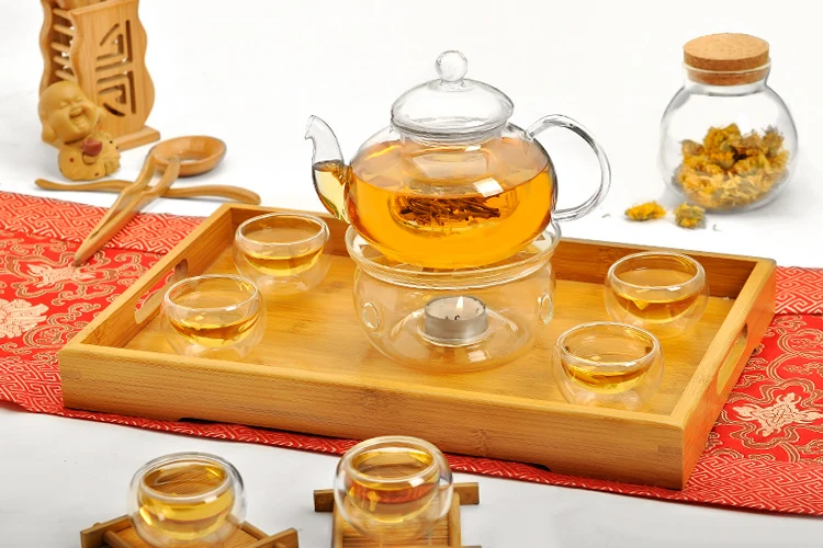 Материал: набор из термостойкого стекла (1 стеклянный чайник + 6 двойных стеклянных стаканчиков, не включая основание с подогревом)