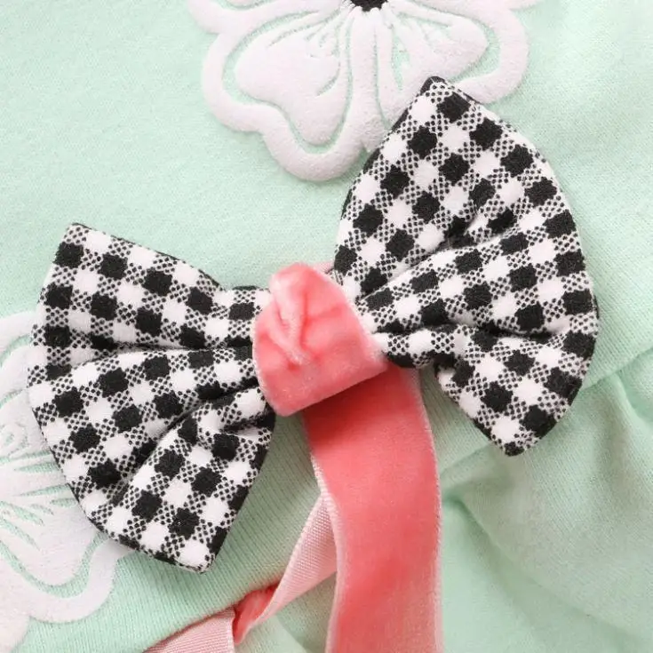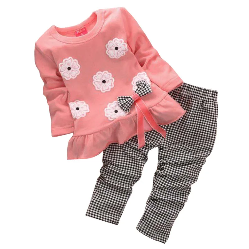 Новинка весны 2021, комплект одежды для маленьких девочек, Детский милый костюм с цветочным бантом, 2 предмета, детский костюм из двух предметов, Топ с длинным рукавом и клетчатые брюки