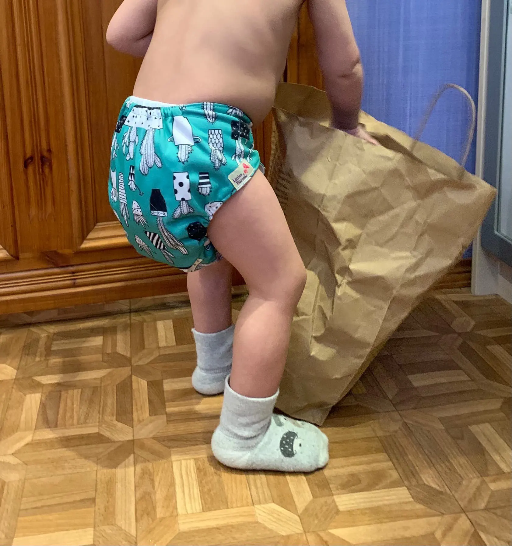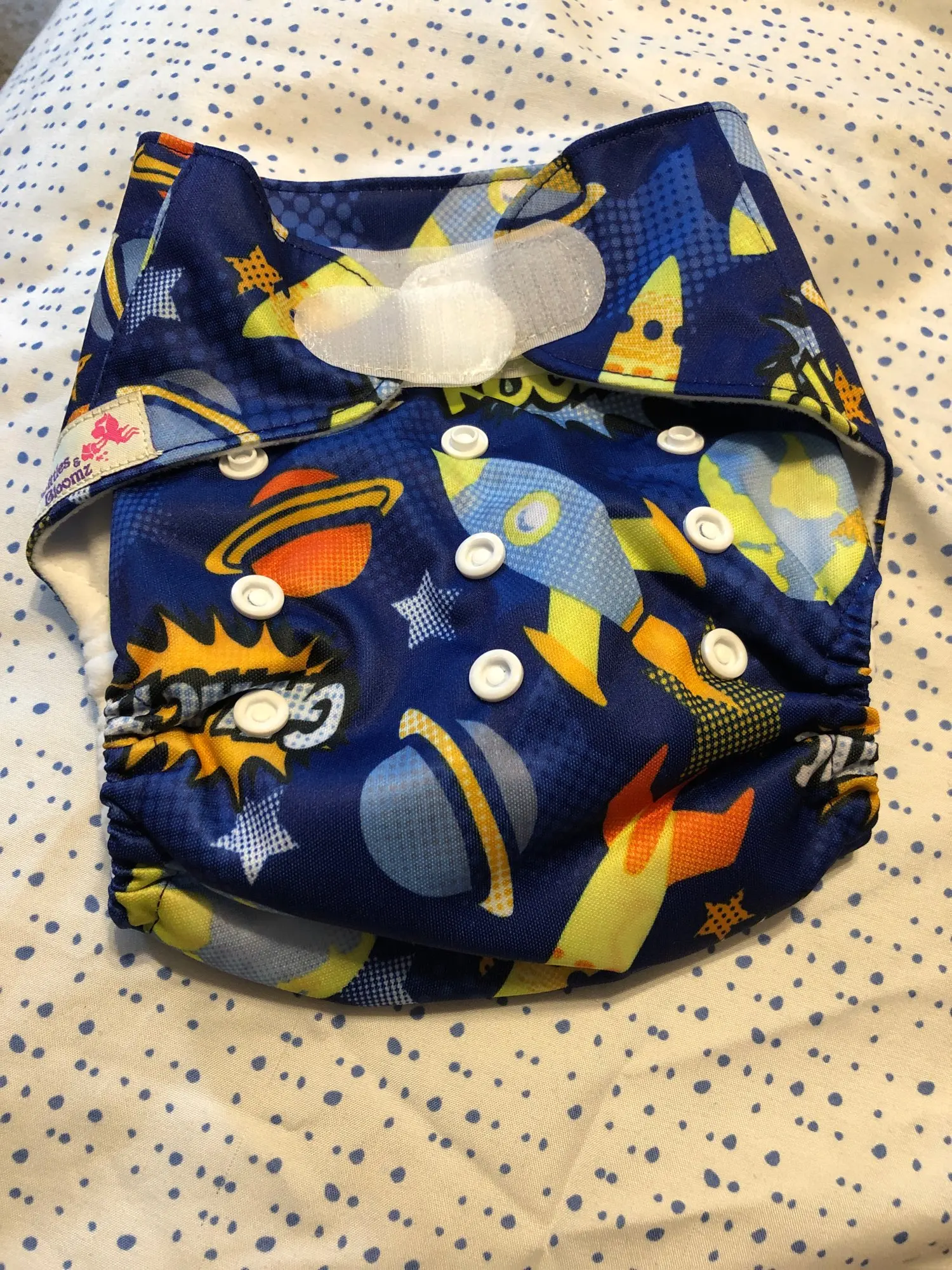 Мне нравится принт. Качество очень хорошее. Я использую Эти подгузники на липучке для 6 смены подгузников, когда я слишком сонный, чтобы связываться с защелками.