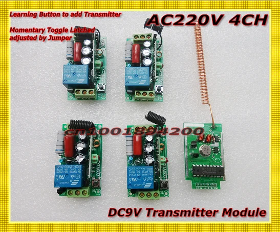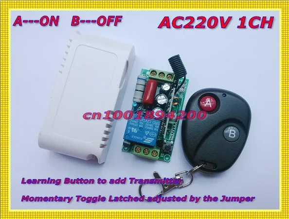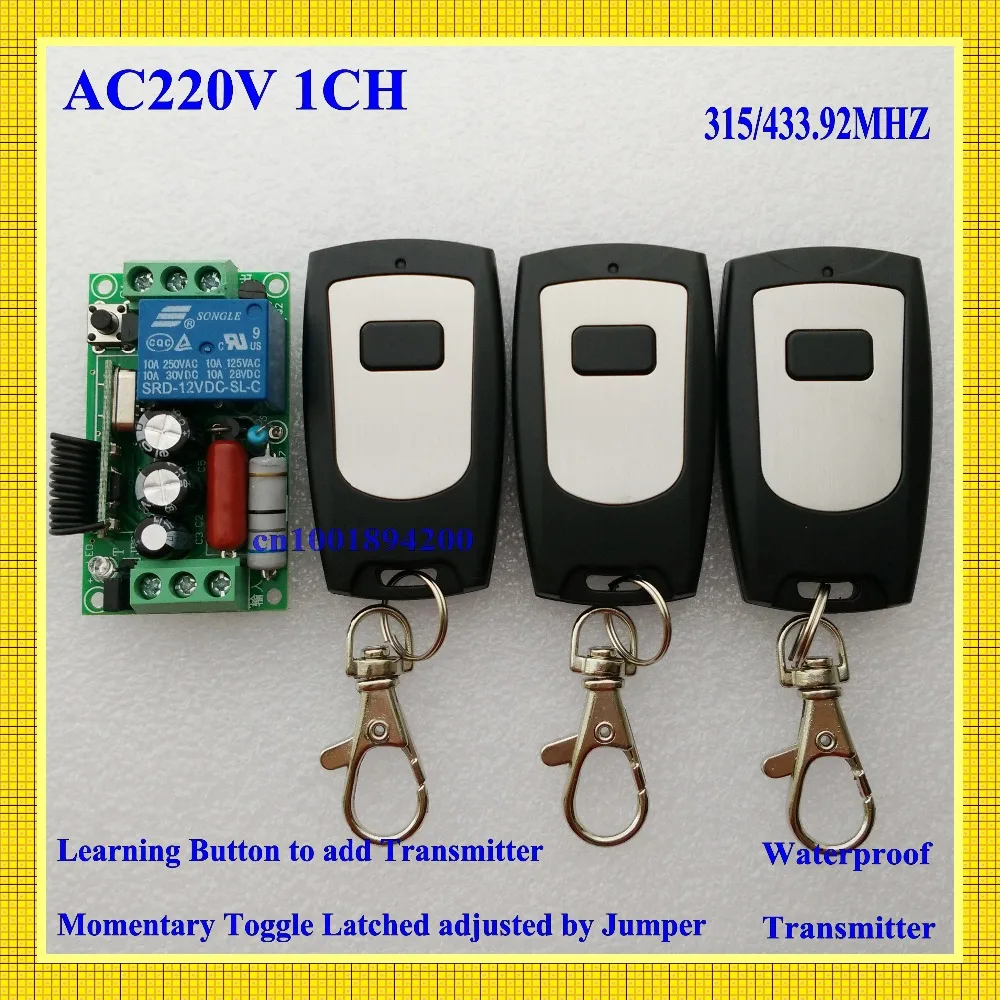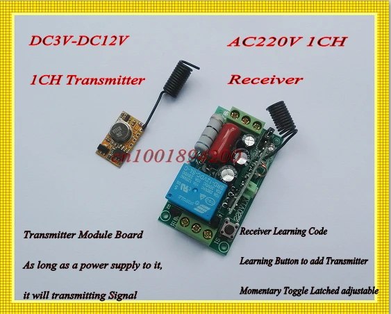 2. Максимальный ток: 10A (лучше, чем 7A)3. Канал: 1CH4. Рабочая частота:315 MHZ/433MZH опционально, оставив массажЧувствительность приемника:-105 дБРабочая температура:-20'C-+ 60'CВыход: Мгновенный. Переключение. Отстегивается перемычкойТип кода: Обучающий код добавьте контроллер с помощью кнопки обучения на приемнике Выходное Состояние:Регулируется перемычкой на доске приемника,