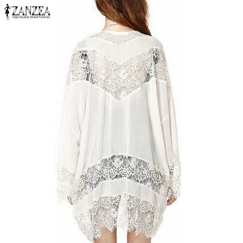Женское винтажное кимоно оверсайз ZANZEA 2021, Повседневный Кардиган, кружевная вязаная шифоновая Свободная блузка, топы, пляжные бежевые, черные, белые
