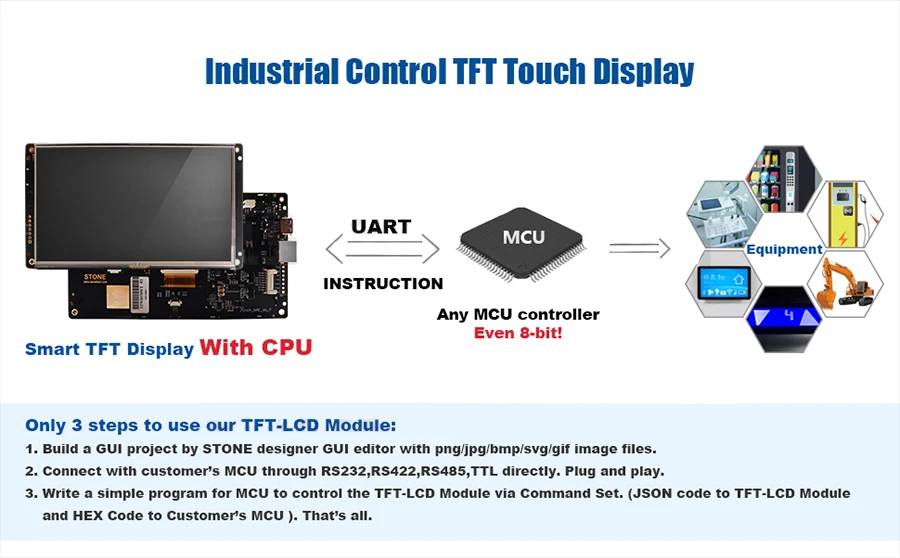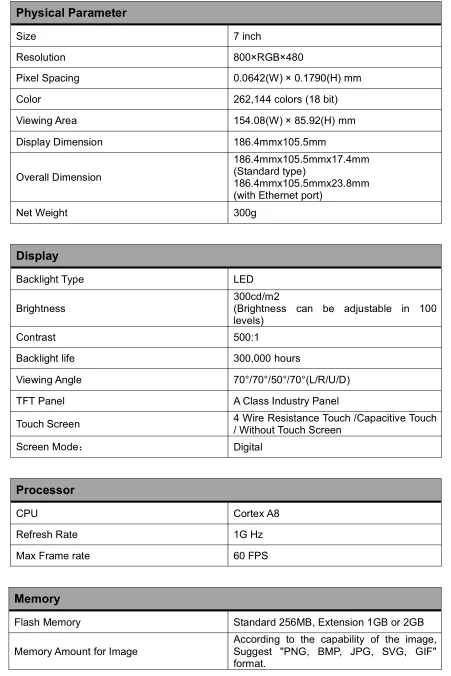 ВSTWI070WT-01Может использоваться для выполнения всех основных функций, таких как отображение текста, отображение изображения, кривой дисплей, а также функции касания, видео и аудио функции и т. Д. Пользовательский интерфейс может быть более широким и разнообразным. И флэш-память может хранить ваши данные, файлы конфигурации, файл изображения, файл шрифта, видео файл и аудио файл и т. Д.-С процессором Cortex A8 1 ГБ Гц и приводным устройством-Контролируется любым MCU-отображение изображения/текста/кривой/видео-262K (18 бит) цветной TFT дисплей-с/без сенсорного экрана-Интерфейс RS232 / RS422 / RS485 / TTL UART и порт USB-Порт Ethernet/Wi-Fi/Bluetooth опционально-Широкий диапазон напряжения