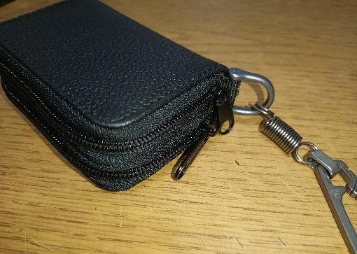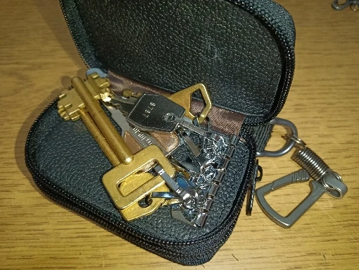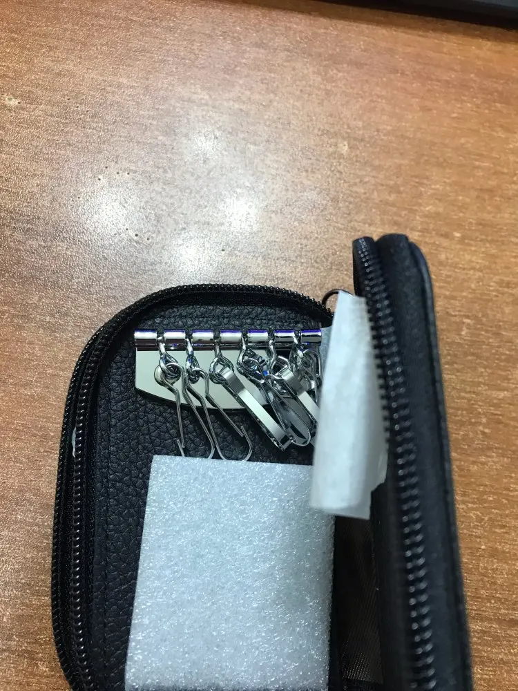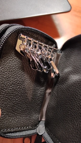 Ключница очень качественная,сделано просто шикарно.Ниток торчащих нет,молнии работают,карабины очень крепкие и тугие-так просто ключ не вывалится.Влезло 3 связки ключей.Пахнет новой кожаной вещью.На ощупь очень приятная,гладкая.